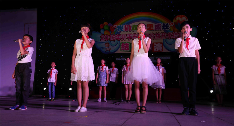 为了更好地陶冶孩子们的艺术情操,激发他们学习艺术的兴趣和愿望,同时,给每一个孩子都提供一个展现自我的舞台和相互学习的机会,7月29日晚上,人民公园罗马小舞台霓灯闪烁,乐声悦耳、舞姿翩跹,热闹非凡,开平市文化馆2016年暑期公益艺术培训班汇报演出在此隆重上演,来自舞蹈班、合唱班、扬琴班、语言表演班等16个班别的200多名学员参加了演出。此次演出形式丰富多彩,内容活泼有趣,现场吸引了500多名家长及市民朋友一起欣赏了学员们的精彩表演。