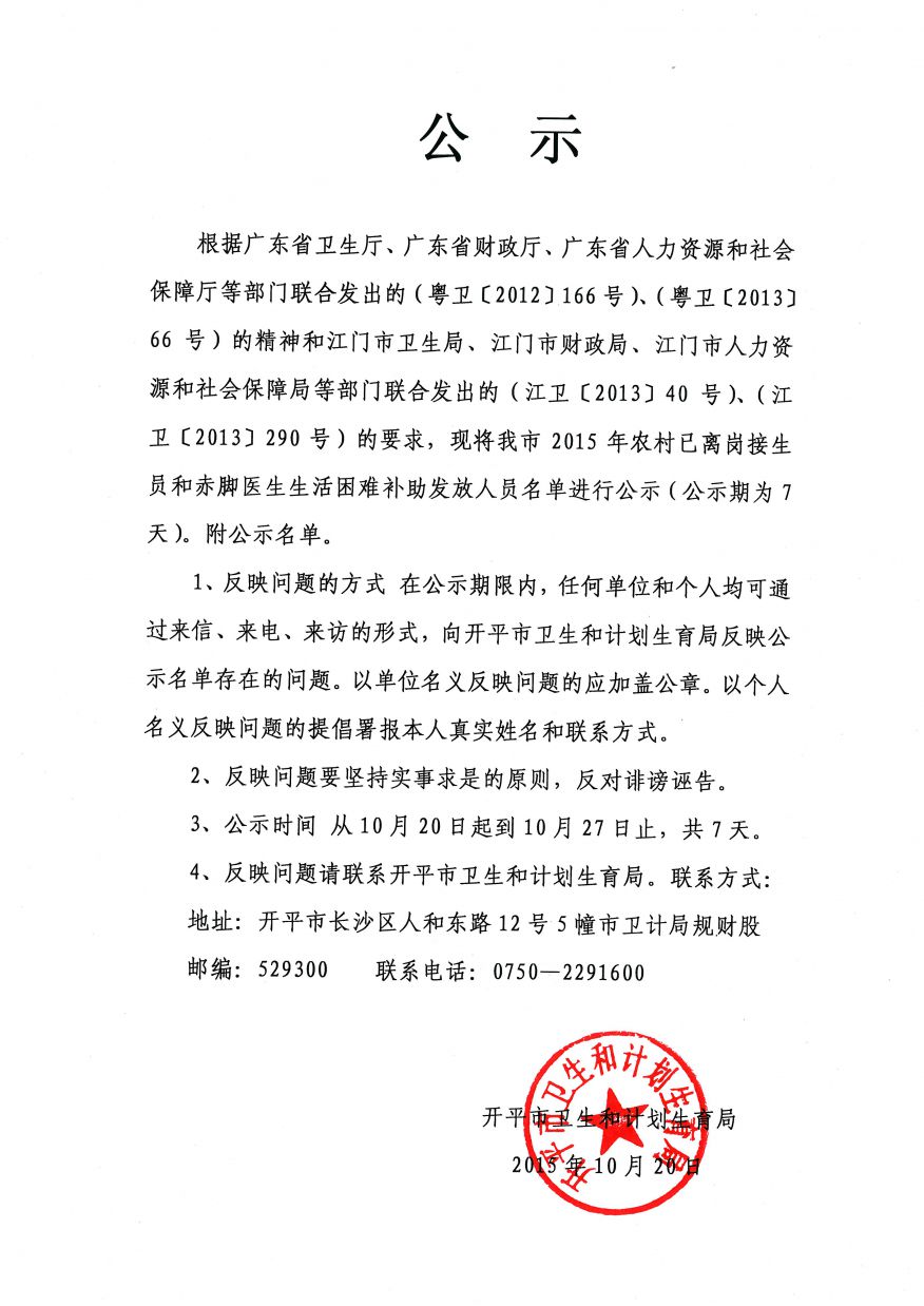 【公示】开平市2015年农村已离岗接生员和赤脚医生生活困难补助发放人员名单