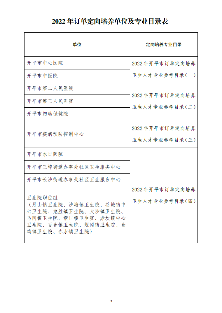 【下载】2022年开平市订单定向培养卫生人才计划报名公示.pdf2022年开平市订单定向培养卫生人才专业参考目录.doc相关链接:2022年开平市订单定向培养卫生人才计划50名!读书每年补助两万还保编制,毕业直接到我市医疗机构工作!