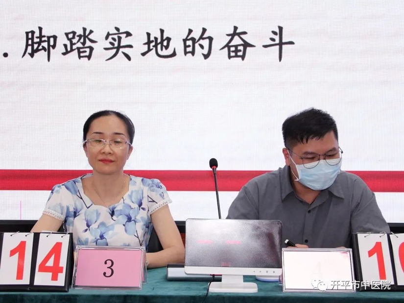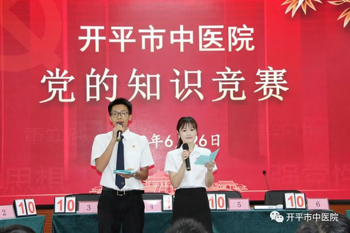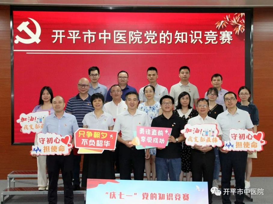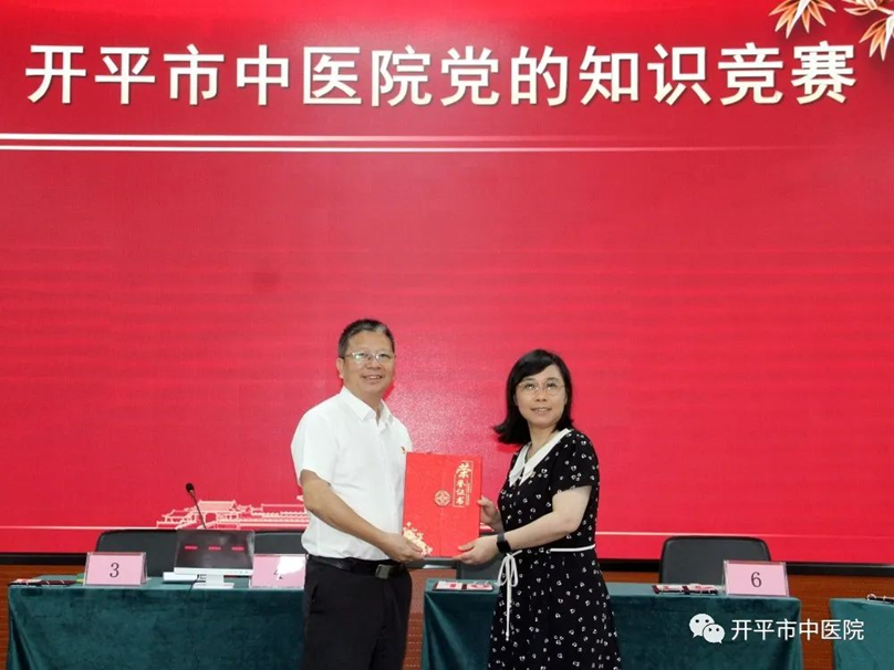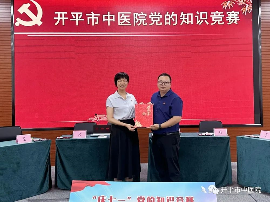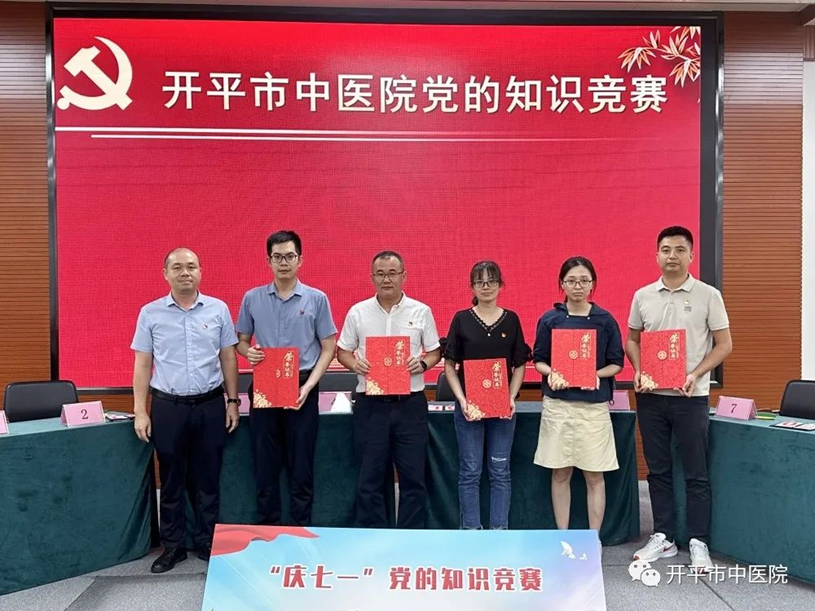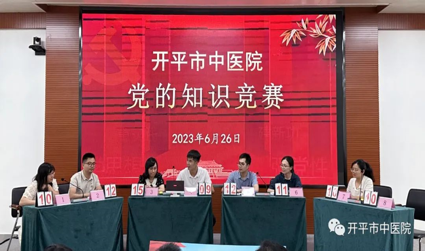 同心筑梦,永跟党走!为庆祝党的生日,增强广大党员责任感和使命感,进一步深化党建工作,6月26日晚上,开平市中医院党委举办庆“七一”党的知识竞赛,14位选手及7个团队登台竞技,一展风采。 竞赛活动在总院多功能厅进行,市卫健局党组成员苏黎明出席活动,医院党政领导班子成员及百余名党员参加。 竞赛设置个人赛和团队赛,分必答题、抢答题两种类型,题目包括党的基本知识、党的二十大知识、党史知识、听红歌猜歌名、看图说史等,内容丰富,知识覆盖面较广。 参赛团队精神饱满,默契配合。选手们沉着冷静,应答如流。 场上比分交替上升,扣人心弦。 党员们热情高涨,纷纷为各自支持的队伍打CALL,掌声、欢呼声此起彼伏,整个比赛过程精彩纷呈,气氛严肃却不失活跃。 经过激烈角逐,方晓虹、周露、陈琰妃分别获得个人赛一等奖、二等奖、三等奖;陈志尧、邓素玲、梁思敏、刘伟健、罗裕津等5人获优胜奖。团队赛,第七党支部获得一等奖,第一党支部获得二等奖,第六党支部获得三等奖。 颁奖仪式 市卫健局党组成员苏黎明及医院党政领导班子成员为获奖个人和团队颁奖。 个人赛 ▲党委副书记、院长胡敏超为个人赛一等奖获得者颁奖 ▲党委委员、副院长陈缘超为个人赛二等奖获得者颁奖 ▲副院长余健成为个人赛三等奖获得者颁奖 ▲党委委员、党政办公室主任周建洲为个人赛优胜奖获得者颁奖 团队赛 ▲市卫健局党组成员苏黎明为团队赛一等奖颁奖 ▲党委委员、副院长劳梅新为团队赛二等奖颁奖 ▲党委委员、党政办公室主任周建洲为团队赛三等奖颁奖 “你们展示了扎实的知识功底和出色的临场反应能力,祝贺你们。”医院党委副书记、院长胡敏超讲话,对获奖个人和团队表示热烈的祝贺,他指出,竞赛活动既检验了党员干部的知识储备,又增强了团队的凝聚力和战斗力,希望全体党员干部不断提高政治站位,凝聚智慧和力量,以党建引领医院高质量发展,为百姓健康护航。