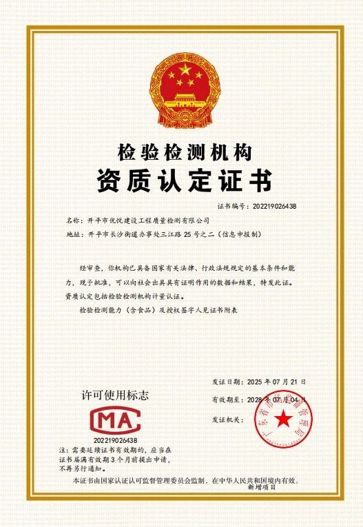 市公控集团属下企业开平市优悦建设工程质量检测有限公司(简称“优悦检测公司”)喜添新专项资质!今年7月5至6日,经广东省市场监督管理局资质评审组全面、严格的现场评审,公司申报的8个类别新增项目顺利通过95个新增参数考核,成功斩获CMA道路工程检测专项资质。此前,公司已持有地基基础、主体结构及装饰装修、建筑材料及构配件三个专项共21个项目检测资质,此次升级后检测参数从263个增至358个。 “事改企”转型,国企活力焕发 2021年4月,乘“事改企”东风,优悦检测公司改制为国有企业。改制后,企业既秉持国企严谨作风,又发挥灵活优势。通过优化管理、把控数据精度、提升服务、开拓市场等科学举措,取得良好效益,为后续发展筑牢根基。 创新扩项攻坚
