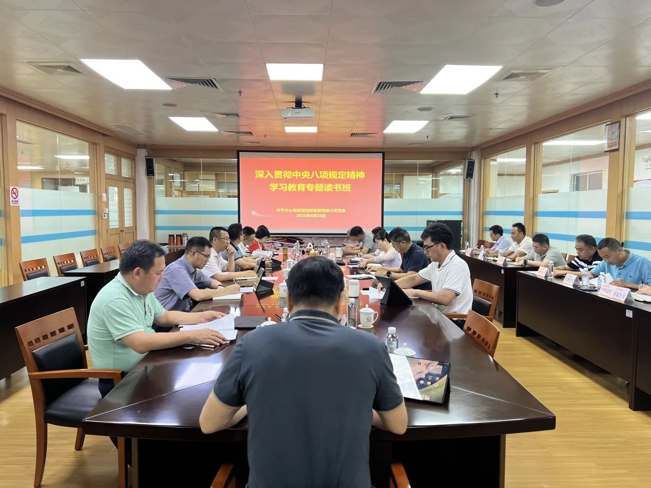 4月22日,公控集团党委举办理论学习中心组(扩大)学习暨深入贯彻中央八项规定精神学习教育专题读书班,认真学习领会习近平总书记关于加强党的作风建设的重要论述,深入学习贯彻中央八项规定及其实施细则精神,推动学习教育走深走实。公控集团党委书记、董事长伍卫良参加读书班并主持集中交流,集团党委班子成员、各部室及下属单位负责人参加读书班。