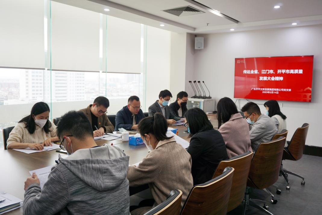 开平文旅集团:勇担发展重任、抓好主责主业, 全力推动企业高质量发展 2月14日上午,开平文旅集团召开党支部(扩大)会议,传达全省、江门市、开平市高质量发展大会精神,以及开平市委十四届四次全会精神,研究部署贯彻落实意见。公司全体党员干部参加会议。 会议强调,要深入贯彻落实全省、江门市、开平市高质量发展大会精神,认真贯彻落实开平市委十四届四次全会精神,进一步增强加快发展的紧迫感、责任感、使命感,勇担发展重任、抓好主责主业,努力推动文旅集团跑出高质量发展加速度。 会议要求,一要把项目建设作为头号工程,提高政治站位,狠抓工作落实。严格按照开平市委“狠抓落实年”工作要求,紧紧围绕“盘活资源招商、加快项目落地、推进发展创收”十八字工作纲领,紧抓项目招商引资、优质项目储备、项目建设提速等方面工作,为文旅集团发展打下坚实基础。二要把发展创收作为第一要务,强化担当意识,力促业务提效。按照公司年度工作部署,紧扣目标、全力冲刺,推动培训、酒店、广告、测绘、物业租赁、活动策划等经营业务加快发展,实现质的有效提升和量的合理增长。三要把学习提升作为永恒课题,加强头脑武装,练就过硬本领。把高质量发展作为首要任务,自觉把思想和行动统一到学习贯彻党的二十大精神和全省、江门市、开平市高质量发展大会精神,以及开平市委十四届四次全会精神上来,找准公司高质量发展突破口,明晰工作方向、提升业务能力,努力打开各项工作新局面。