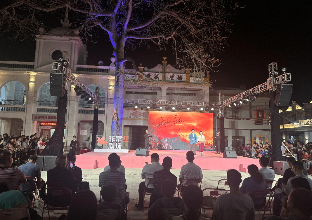 茶档档主黄女士:“这次活动很有地方特色,我们是从台山过来的,带来了招牌柠檬茶、罐罐烤奶、鲜榨橙汁等。” 文创摊主林女士:“我们设计了一批《乡愁印迹》的冰箱贴,利用华侨和乡民共同修筑的开平第一条汽车路百赤茅公路以及茅冈车站等元素设计而成,希望通过冰箱贴连接世界华侨和百合人的回忆。” 文艺晚会上,舞蹈《雨打芭蕉》、歌唱《杨桃林情歌》、故事《木棉英雄》、话剧《木棉花开》等节目轮番上演,精彩的表演赢得现场观众的阵阵掌声,大家齐忆英雄故事、歌颂美丽百合、共传红棉精神。随着演出落幕,晚会的“重头戏”烟花秀正式开始,璀璨的焰火绽放于夜空,点燃茅冈村“烟火气”。 市民余女士:“我第一次来茅冈村,觉得市集很热闹,这里将古色古香的圩市进行活化。之前我也听过周文雍的故事,今天看了这个话剧让我对故事有更深的理解,这种红色话剧非常值得向群众推广。”