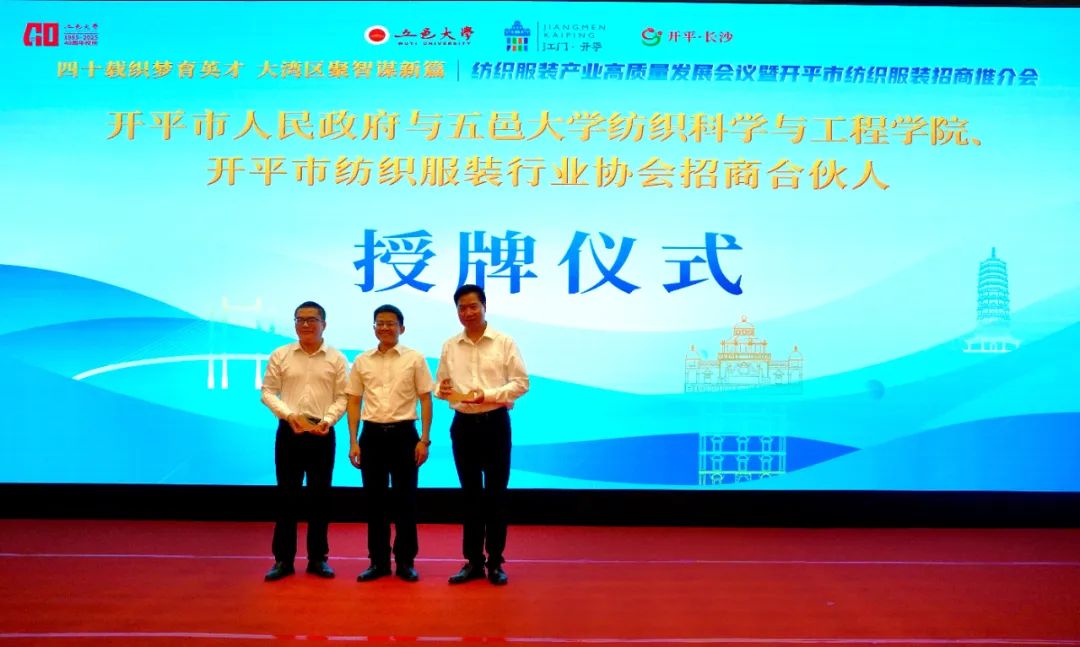 推介会上播放了《开平市招商宣传片》,展示了开平经济社会最新发展成果和未来图景;相关领导聚焦开平高质量发展主线,围绕资源优势、营商环境、产业发展前景等方面展开全方位宣传推介,诚邀广大客商到开平投资兴业。 开平市作为中国纺织产业基地市,纺织服装产业是开平传统支柱产业之一,在稳就业、促发展方面起到了重要作用。近年来,开平市积极发挥纺织服装产业优势,通过技术改造、数字化转型与绿色环保改革等,多措并举推动传统产业转型升级,助力区域经济高质量发展。目前,开平纺织业已构建起覆盖原材料生产、印染加工、服装制造到外贸出口的全产业链条。 纺织服装产业的发展,离不开高校的支持。五邑大学纺织科学与工程学院扎根侨乡沃土,深耕纺织服装知识和技术领域,为开平、江门乃至粤港澳大湾区培养输送了大批高素质专业技术人才,是推动产业转型升级的“人才摇篮”和“智力宝库”。五邑大学党委常委、副校长董超俊表示,今年正值五邑大学建校40周年,希望学校继续发挥学科与科研优势,与开平纺织企业开展更深层次、更广领域的产学研合作,共同谱写“校地合作、协同创新”的新篇章。 在现场举行的签约仪式上,五邑大学纺织科学与工程学院与开平市纺织服装行业协会签订人才培养战略合作协议;长沙街道办事处与江门市津泓新材料科技有限公司签订投资意向协议;开平市新红日制衣有限公司与上海美武信息技术有限公司签订数字化转型投资协议,为开平纺织产业人才储备、技术升级及全链条高质量发展注入强劲动能。 同时,开平市向五邑大学纺织科学与工程学院、开平市纺织服装行业协会授予“招商合伙人”牌匾,精准赋能开平纺织产业链招商;五邑大学向开平市红日制衣有限公司授予“五邑大学校外实习基地”牌匾,进一步促进人才培养与实践教学的双向融合。 会上还开展了主题报告环节,邀请纺织服装产业领域专家围绕当前纺织服装行业发展形势和热点难点,分享开平纺织服装产业如何抢抓机遇、应对挑战的对策建议,共同探索行业发展,加快培育和发展新质生产力。