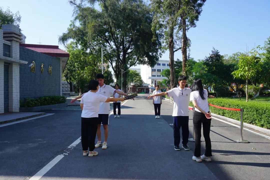 开侨中学教务处副主任屈春章:“如果安检门检测到有同学带了违禁物品,那两个流动监考员负责复检工作,重新使用金属探测仪进行检测,如果真的发现有违规物品就要拿出来放到考场外,复检的同学也要从复检通道回来再次通过安检门。” 为了提高考生入场速度,开侨中学考点共配备四台智能安检门并分开放置,同时,每座智能安检门将安排4名监考员负责纪律、观察、复检等各项流程,减少检测时间。顺利通过第一次金属探测仪检测以及智能安检门进入考场封闭区后,所有考生还将在考场入口处接受第二次金属探测仪检测,通过“智能+人工”双安检模式,将手机等智能设备拒之门外。