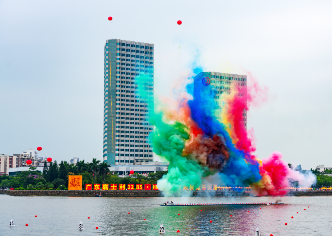 仲夏时节的潭江河畔,鼓声震天,浪花激扬。随着水面冷烟花的璀璨绽放和开赛令下,一艘艘蓄势待发的龙舟如离弦之箭般冲破水面。水面之上,鼓点强劲如雷鸣,舵手精准指挥,队员们弓身发力,整齐的船桨划破碧波,水花飞溅间展现着力与美的完美融合。