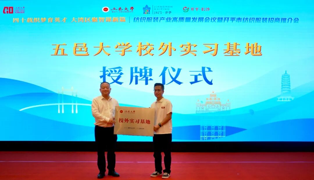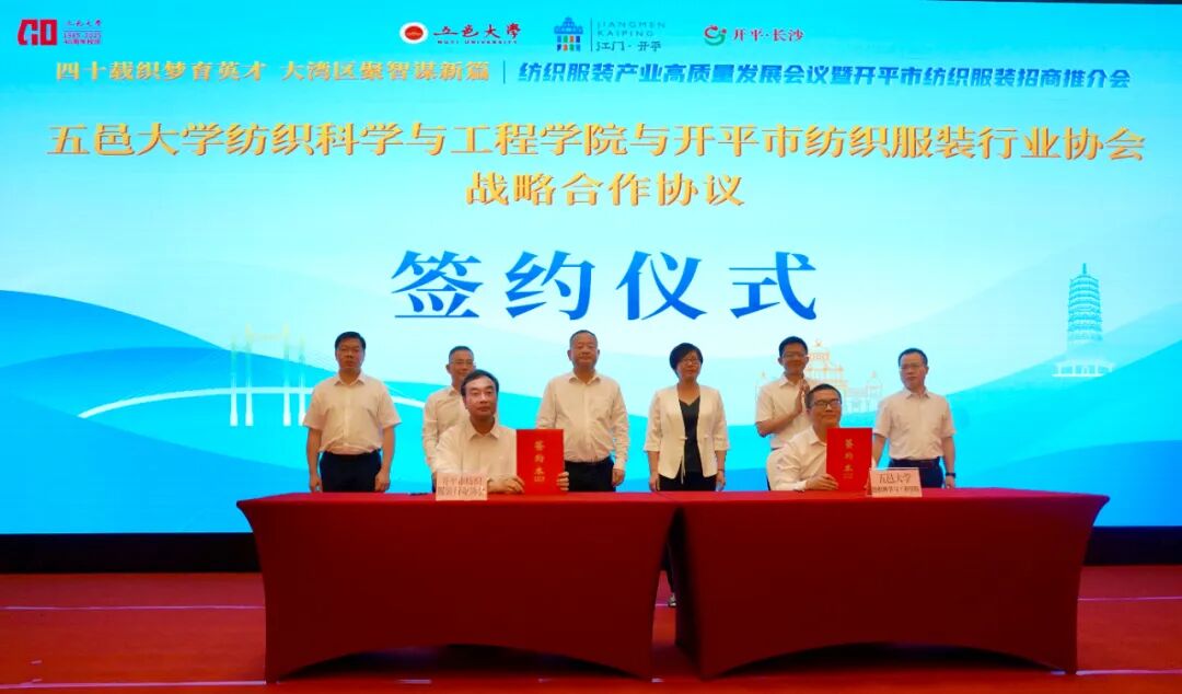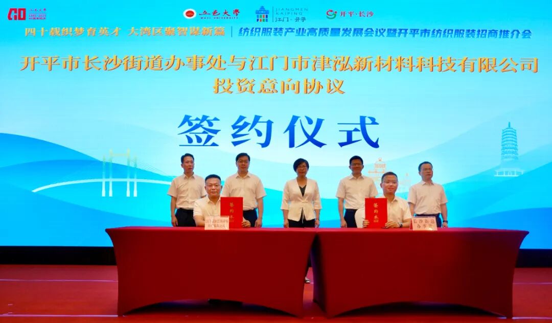 推介会上播放了《开平市招商宣传片》,展示了开平经济社会最新发展成果和未来图景;相关领导聚焦开平高质量发展主线,围绕资源优势、营商环境、产业发展前景等方面展开全方位宣传推介,诚邀广大客商到开平投资兴业。 开平市作为中国纺织产业基地市,纺织服装产业是开平传统支柱产业之一,在稳就业、促发展方面起到了重要作用。近年来,开平市积极发挥纺织服装产业优势,通过技术改造、数字化转型与绿色环保改革等,多措并举推动传统产业转型升级,助力区域经济高质量发展。目前,开平纺织业已构建起覆盖原材料生产、印染加工、服装制造到外贸出口的全产业链条。 纺织服装产业的发展,离不开高校的支持。五邑大学纺织科学与工程学院扎根侨乡沃土,深耕纺织服装知识和技术领域,为开平、江门乃至粤港澳大湾区培养输送了大批高素质专业技术人才,是推动产业转型升级的“人才摇篮”和“智力宝库”。五邑大学党委常委、副校长董超俊表示,今年正值五邑大学建校40周年,希望学校继续发挥学科与科研优势,与开平纺织企业开展更深层次、更广领域的产学研合作,共同谱写“校地合作、协同创新”的新篇章。 在现场举行的签约仪式上,五邑大学纺织科学与工程学院与开平市纺织服装行业协会签订人才培养战略合作协议;长沙街道办事处与江门市津泓新材料科技有限公司签订投资意向协议;开平市新红日制衣有限公司与上海美武信息技术有限公司签订数字化转型投资协议,为开平纺织产业人才储备、技术升级及全链条高质量发展注入强劲动能。 同时,开平市向五邑大学纺织科学与工程学院、开平市纺织服装行业协会授予“招商合伙人”牌匾,精准赋能开平纺织产业链招商;五邑大学向开平市红日制衣有限公司授予“五邑大学校外实习基地”牌匾,进一步促进人才培养与实践教学的双向融合。 会上还开展了主题报告环节,邀请纺织服装产业领域专家围绕当前纺织服装行业发展形势和热点难点,分享开平纺织服装产业如何抢抓机遇、应对挑战的对策建议,共同探索行业发展,加快培育和发展新质生产力。