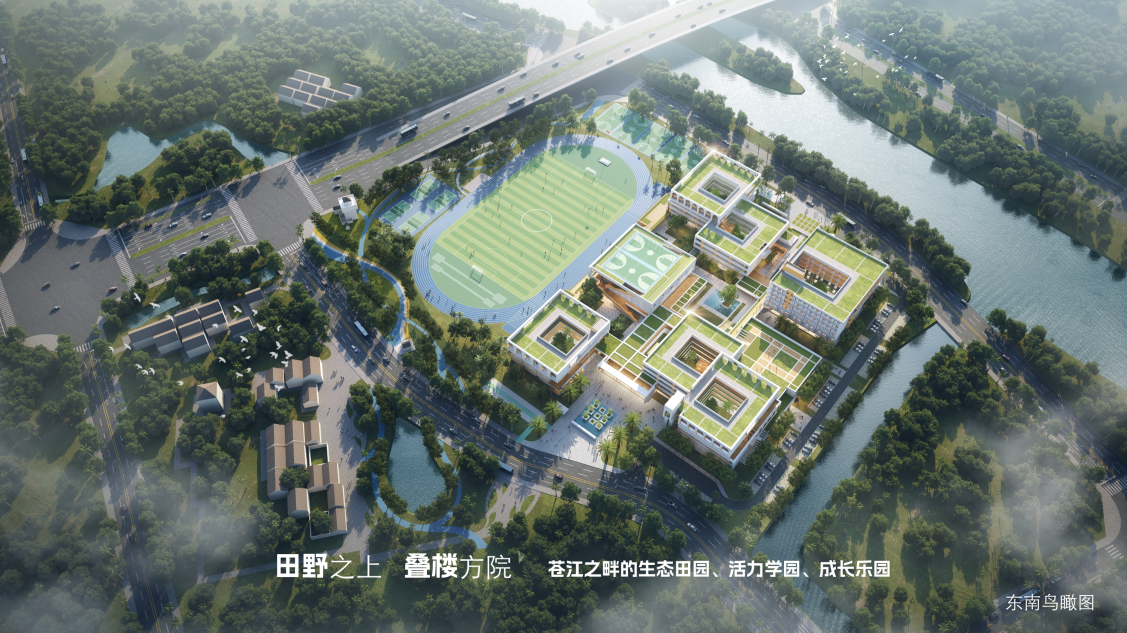 设计理念:方案以“未来书院”为设计概念,在校园中心引入绿岛公园,环绕布置休憩游廊,构建共享交通环,而建筑群落则以院落形式环绕聚心落位,于空间布局上呈现出围合的形态,与碉楼的保护、守望内核相呼应,承古启新,塑造新时代的侨乡书院。