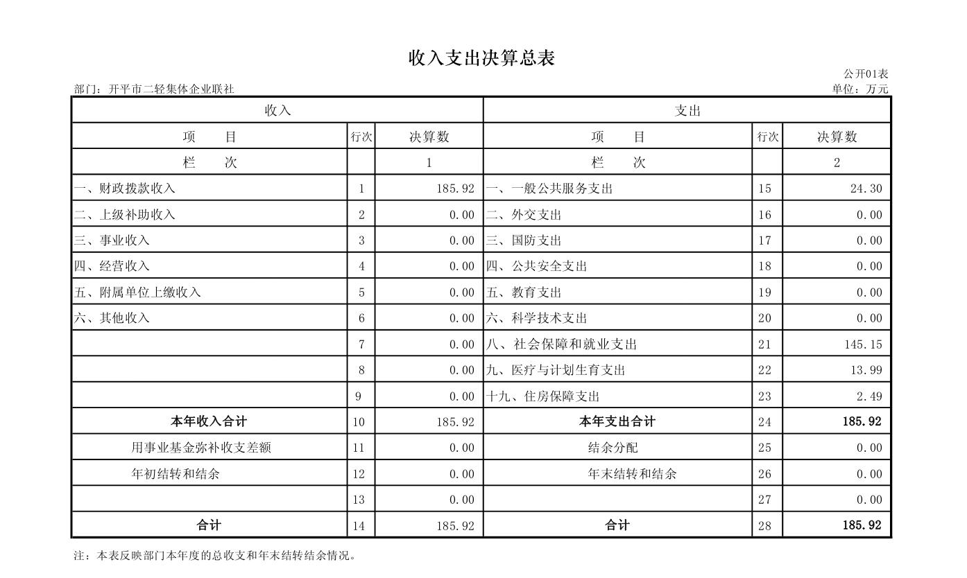开平市二轻集体企业联社2015年度总收入185.92万元,其中本年收入185.92万元。具体情况如下: