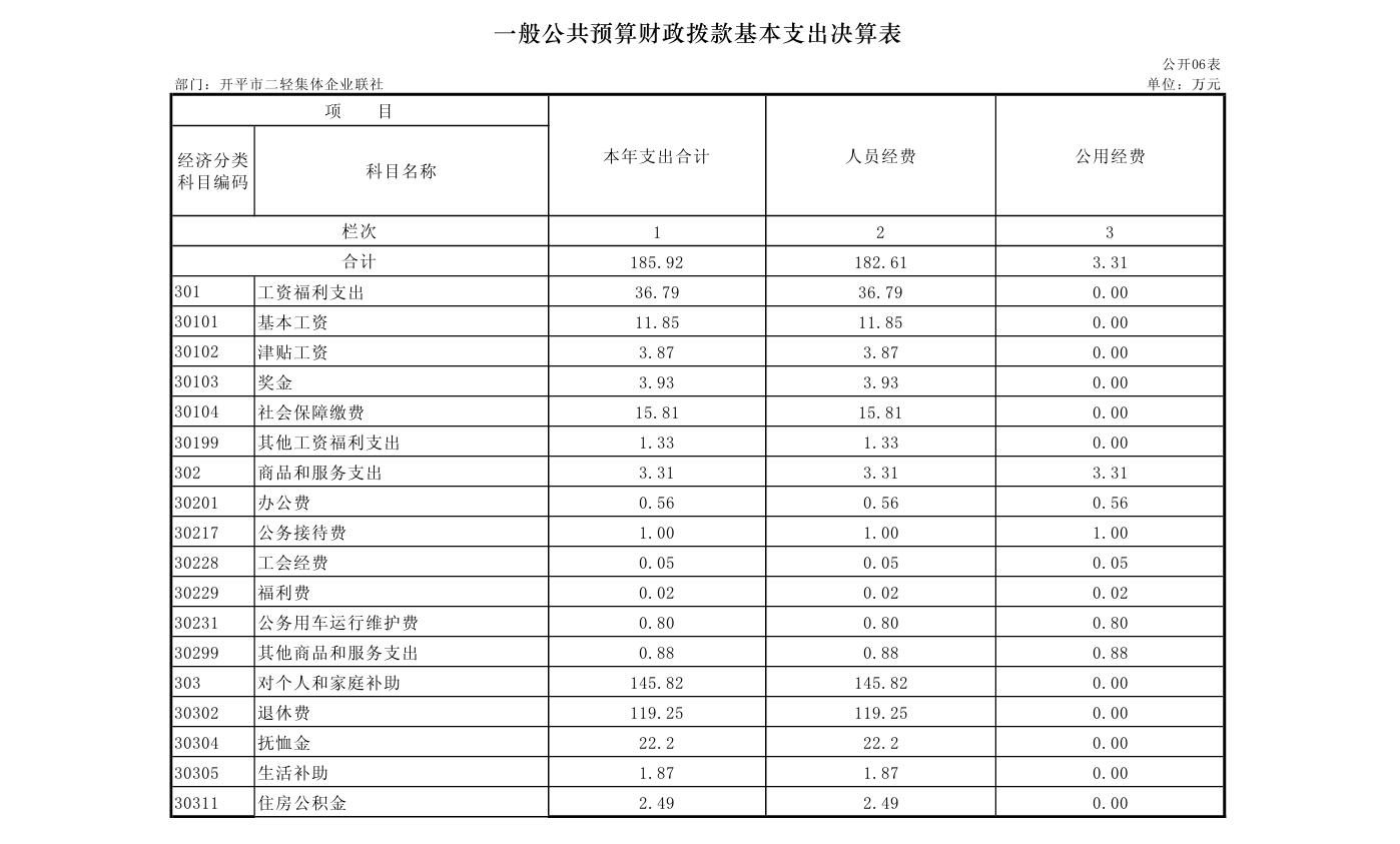 开平市二轻集体企业联社2015年度财政拨款支出合计185.92万元。其中:一般公共预算财政拨款支出185.92万元,比2014年决算数增加20.72万元,增长12.54%,主要原因是工资及退休费调整。