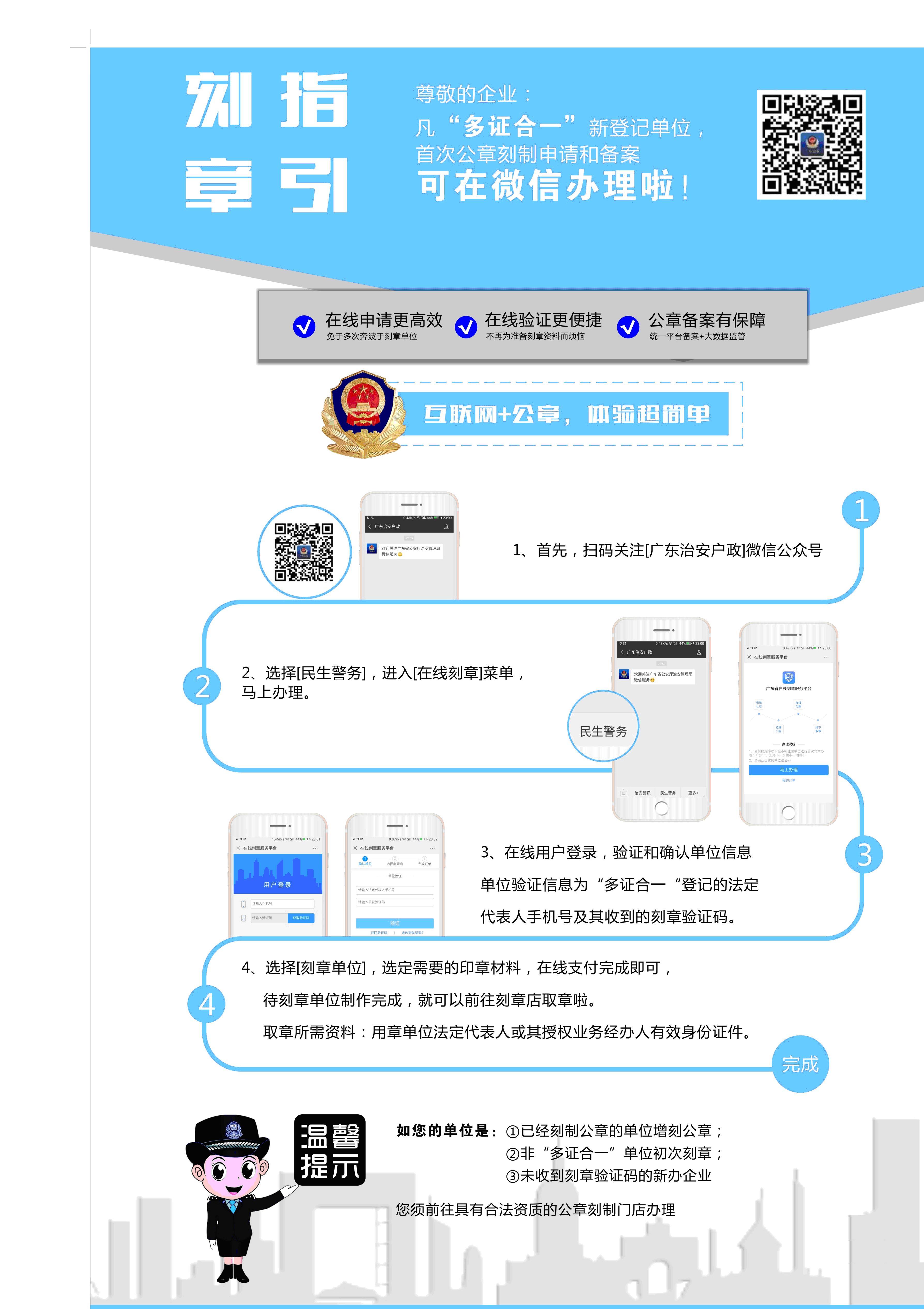 2018年,广东省公安厅在全省推广使用广东省公章治安管理信息系统,创新推出了手机端在线刻章便民服务。江门市全面推进“互联网+公章”服务与监管新模式,并于2018年10月1日正式上线广东省公章治安管理信息系统。10月20日全市范围内全面取消非芯片公章备案,新制作及因磨损、丢失等需要重新更换的公章须统一嵌入安全芯片。
