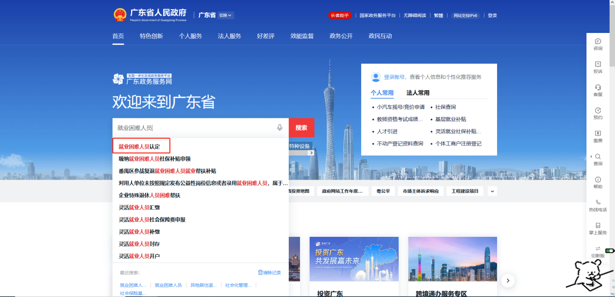 1.网上办理:线上访问“广东政务服务网”(https://www.gdzwfw.gov.cn),搜索“就业困难人员认定”,点击“在线办理”。