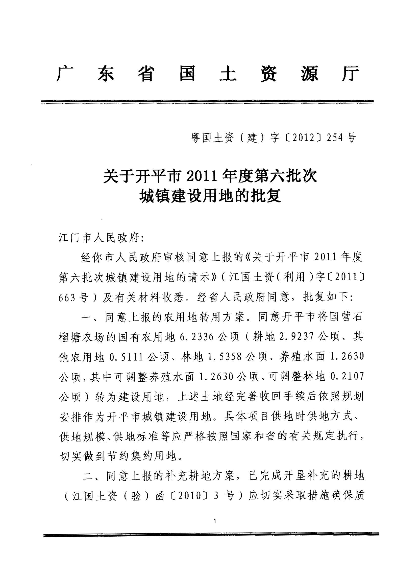 开平市2011年度第六批次城镇建设用地的批复