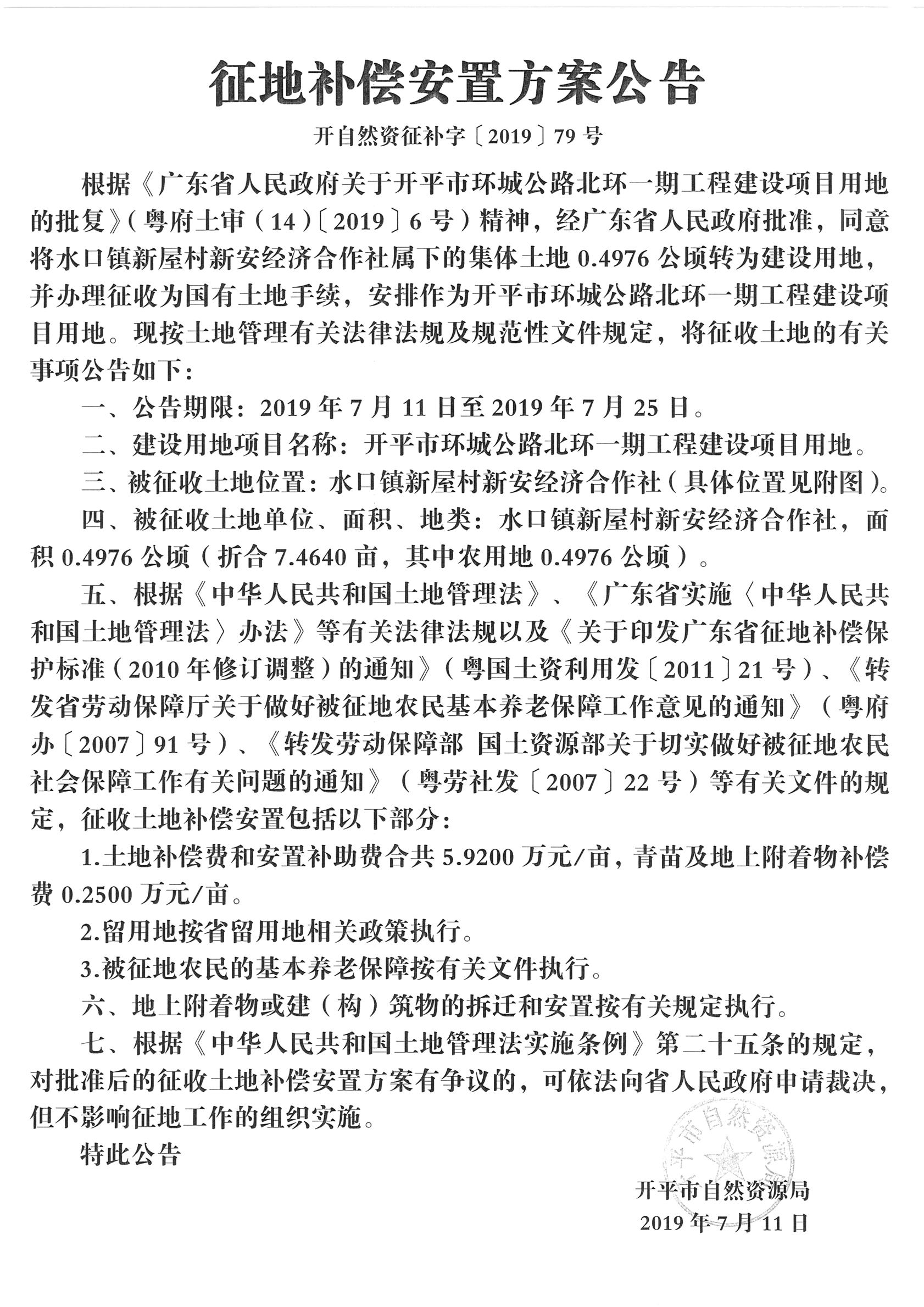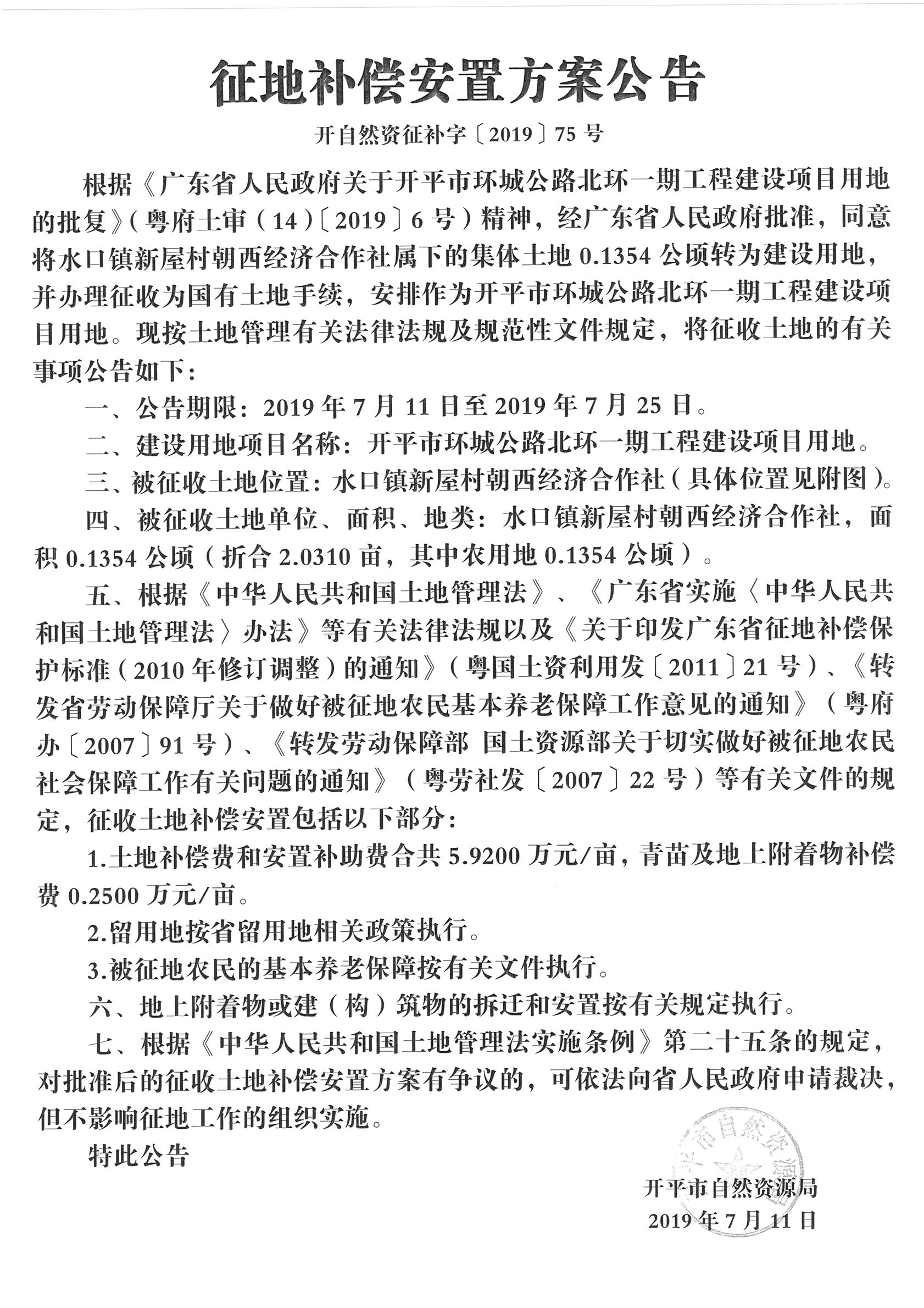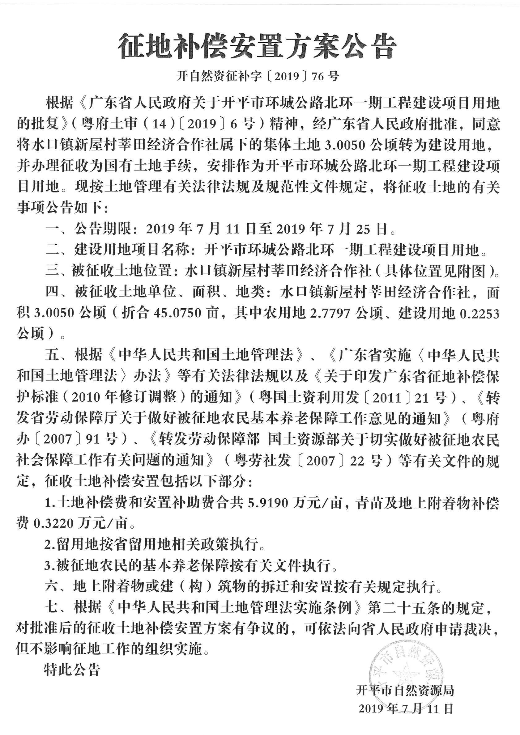 征地补偿安置方案公告(开平市环城公路北环一期工程建设项目用地)
