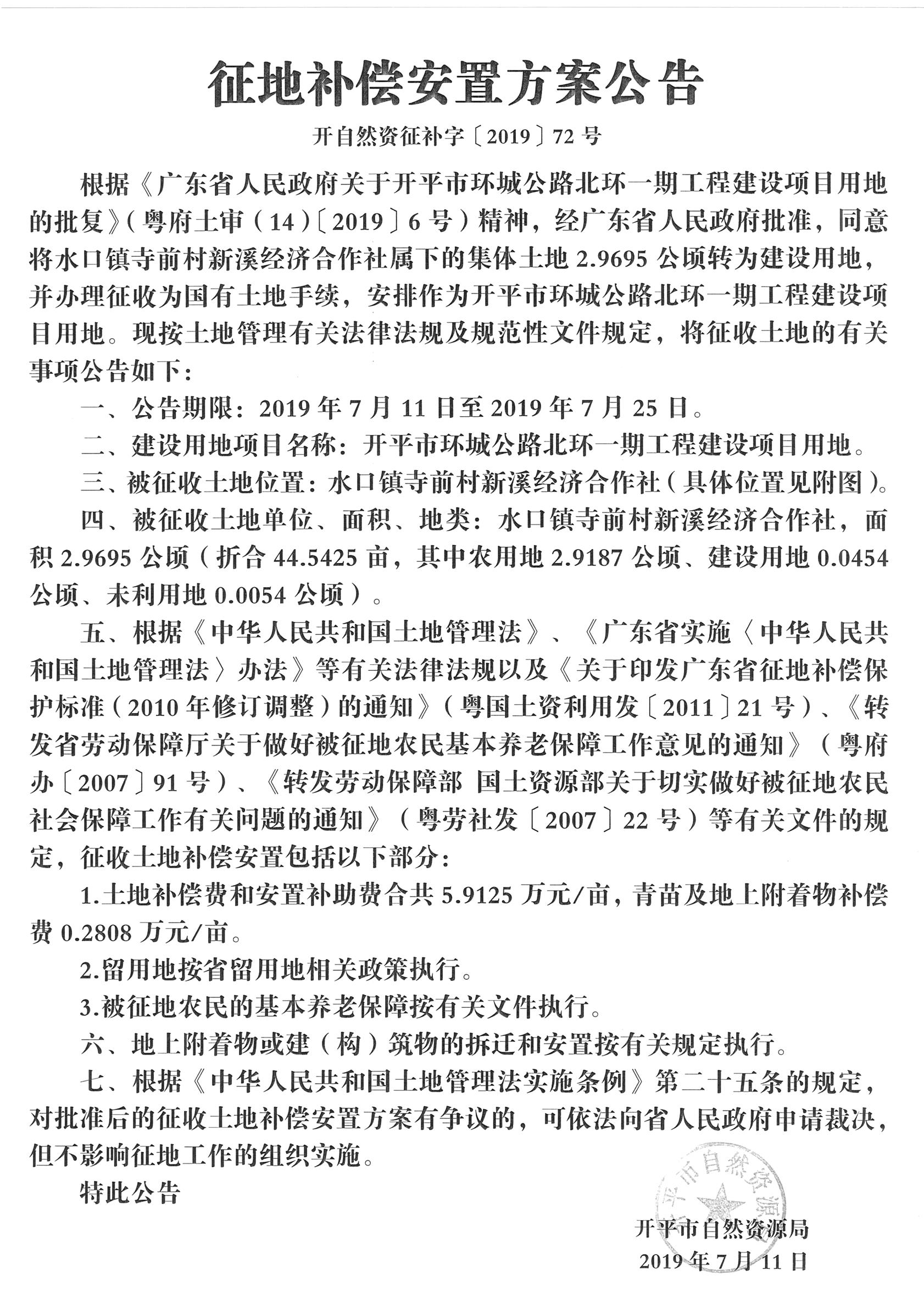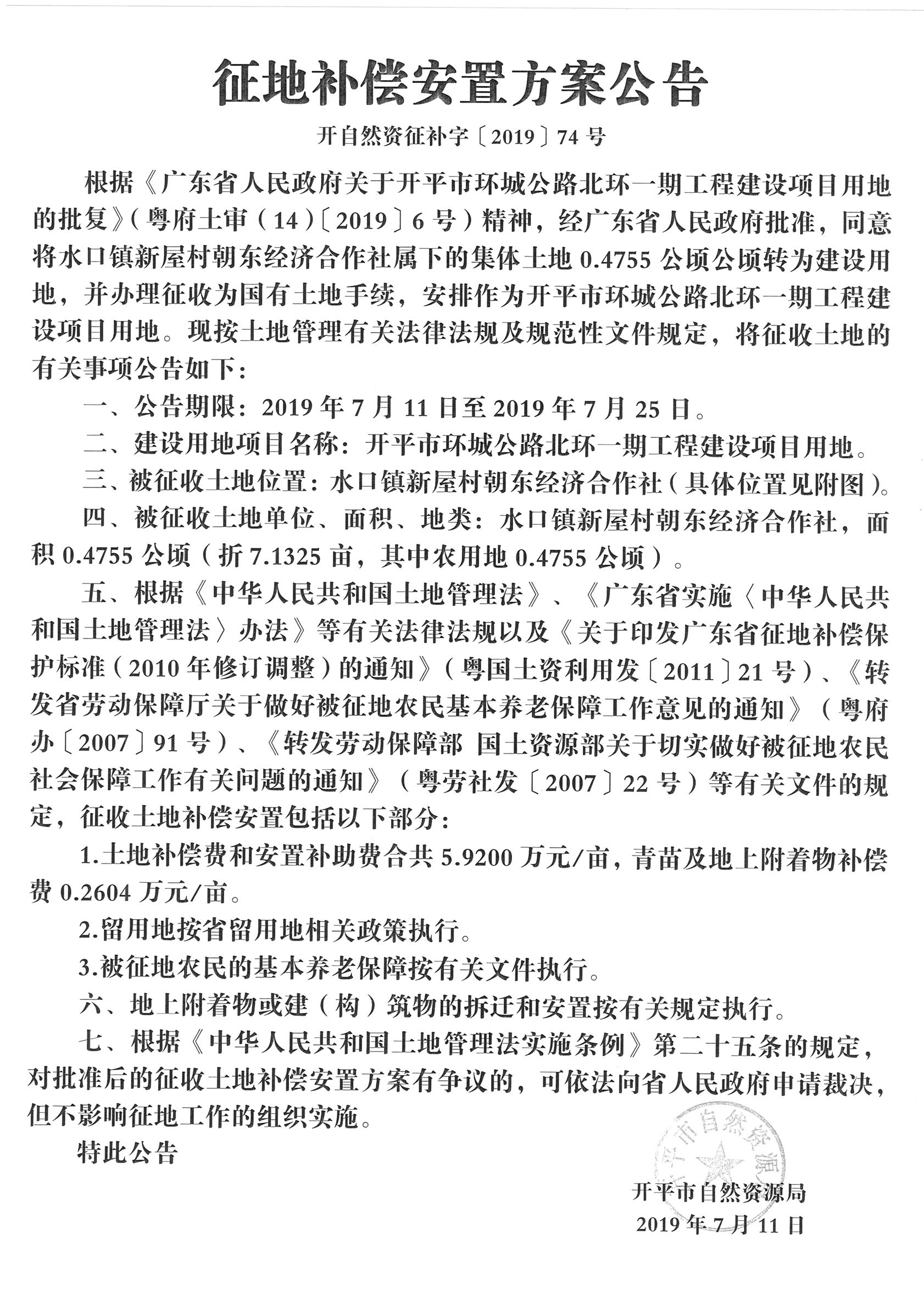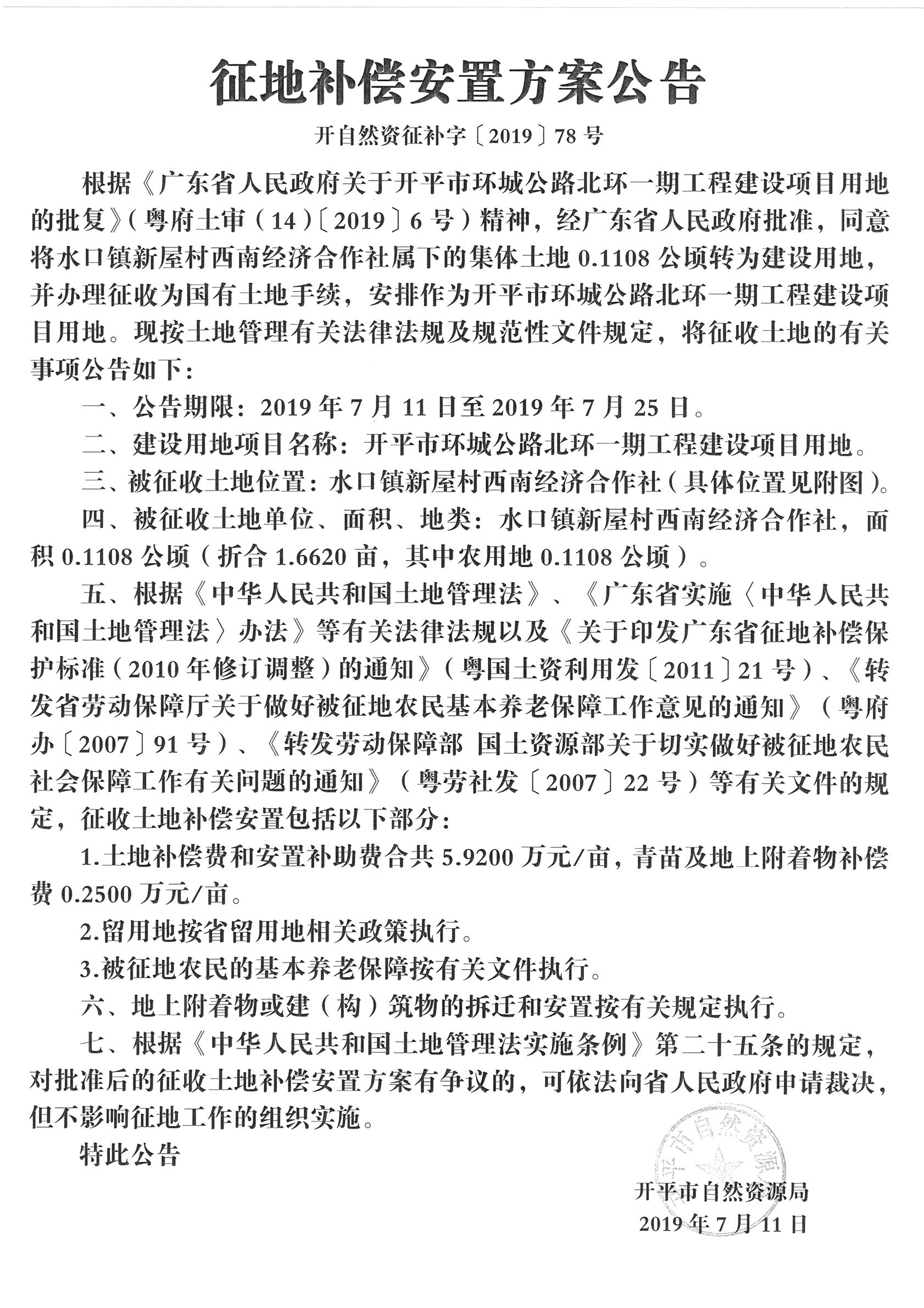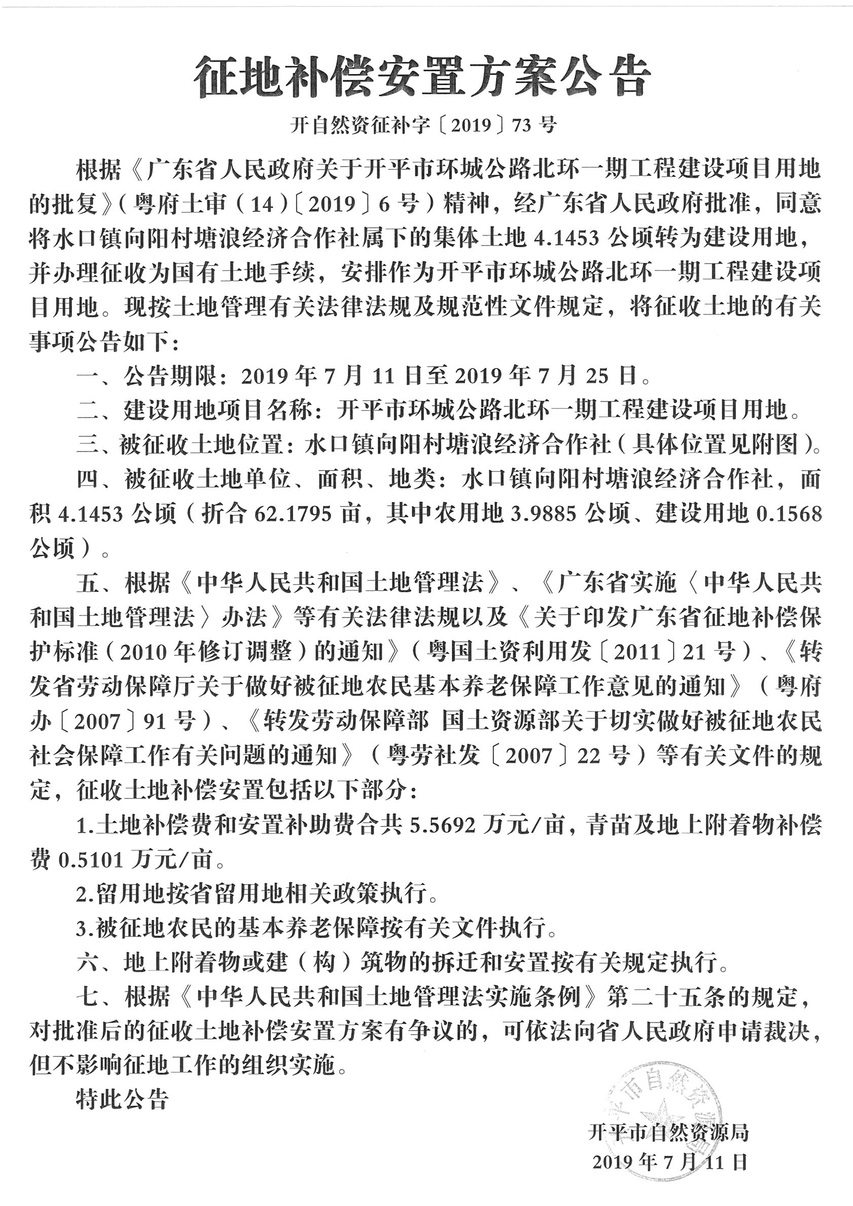 征地补偿安置方案公告(开平市环城公路北环一期工程建设项目用地)
