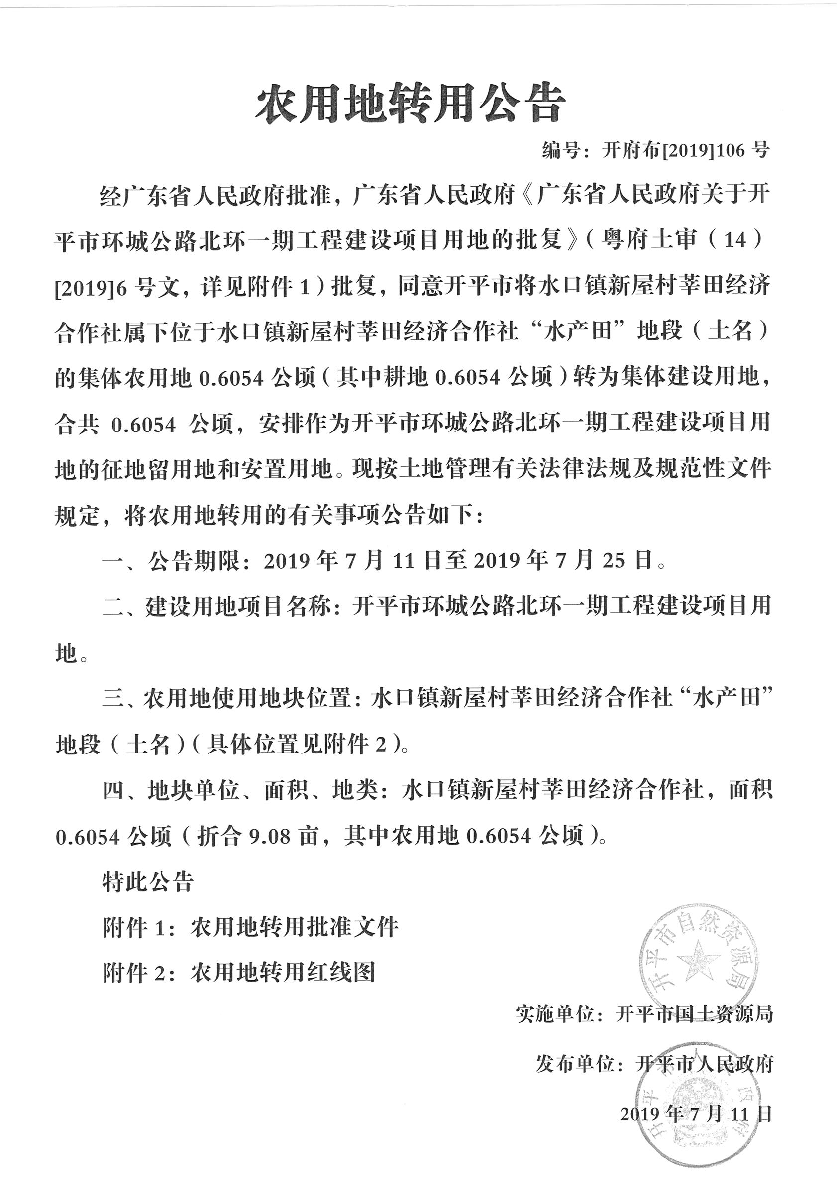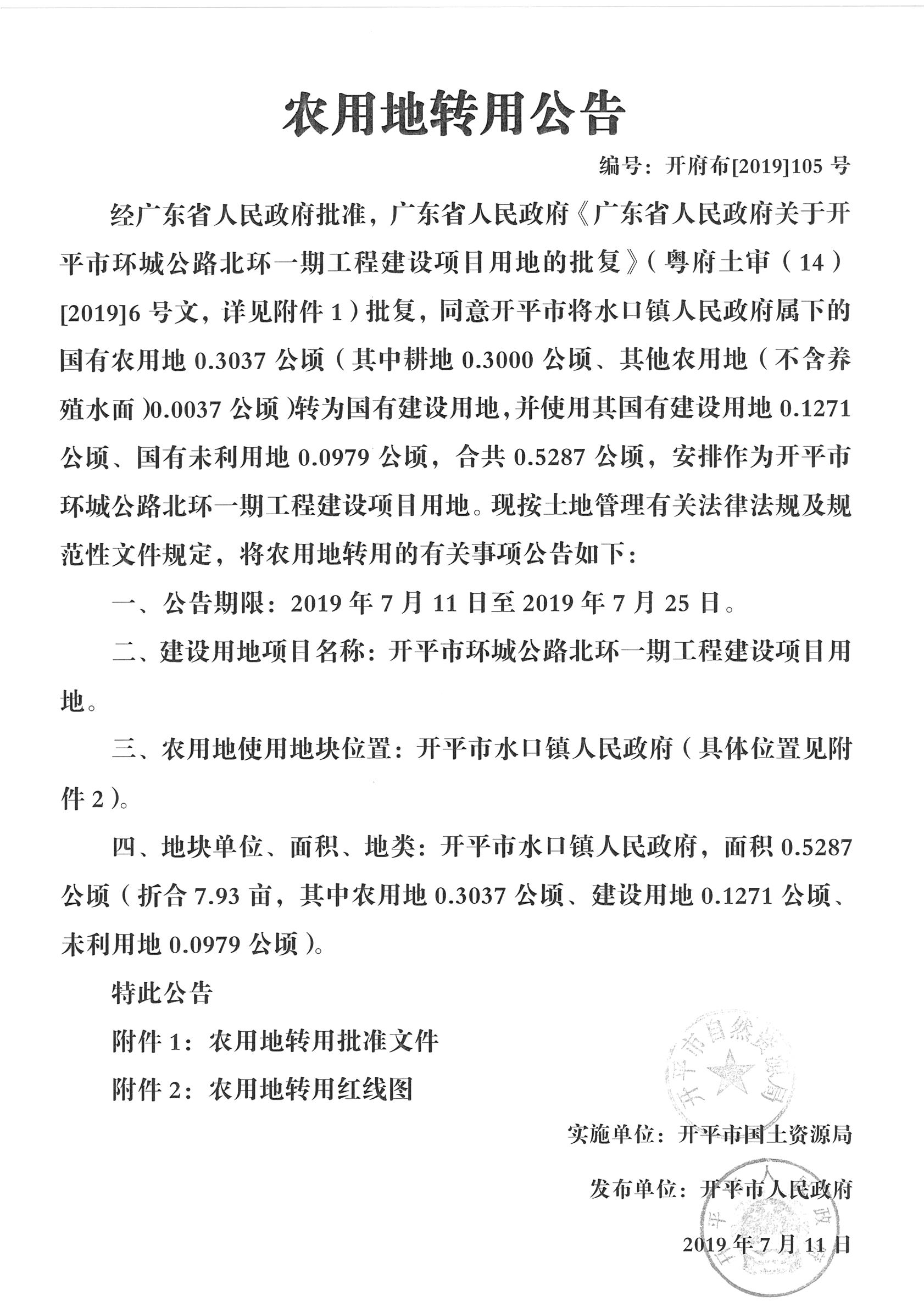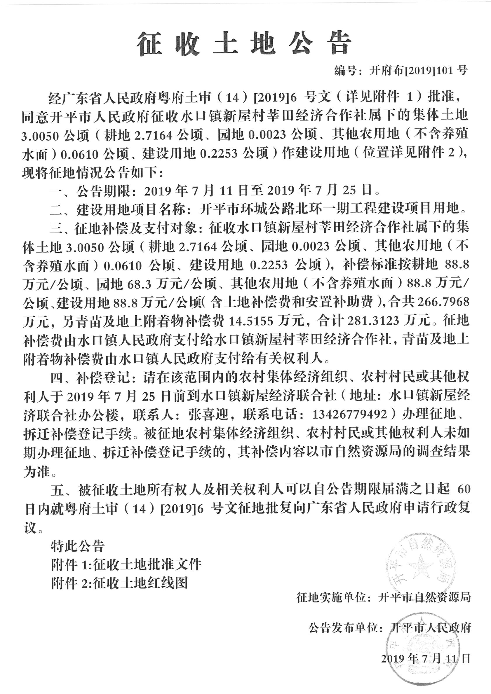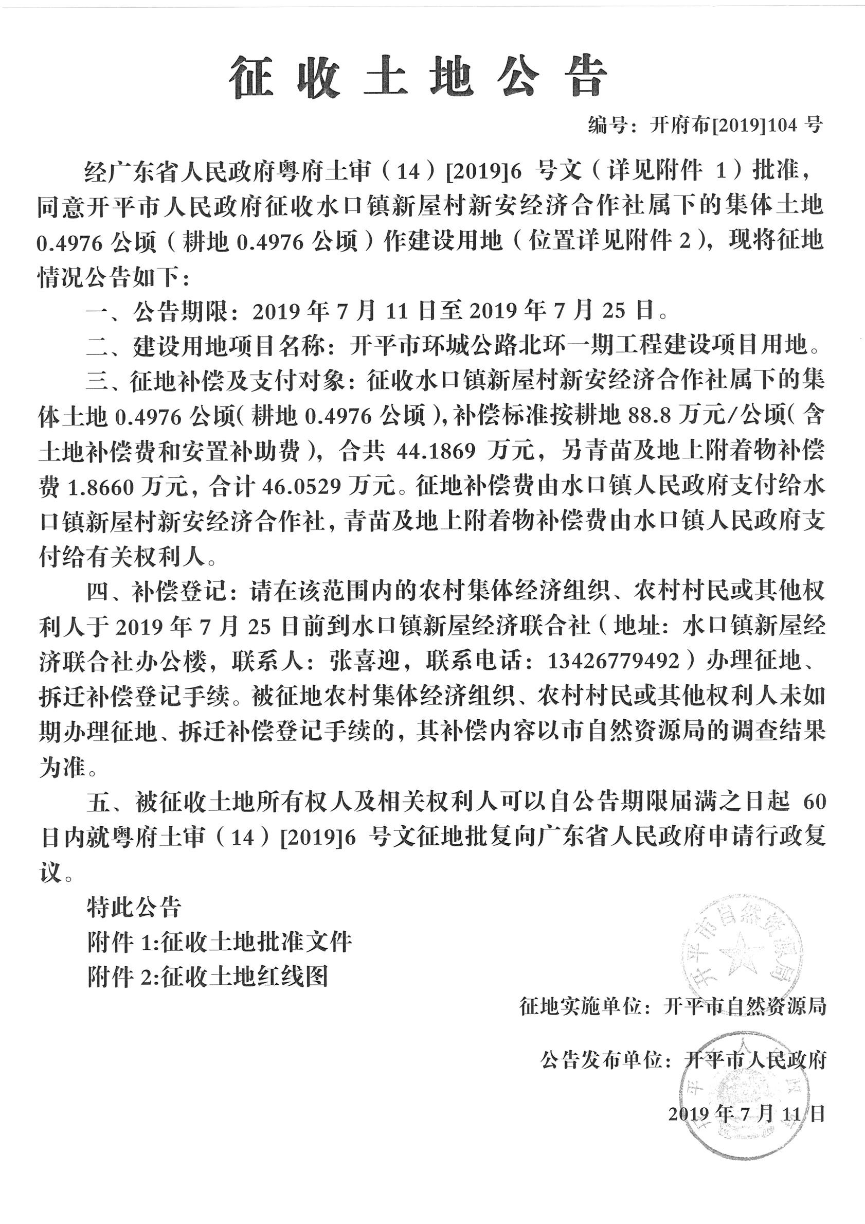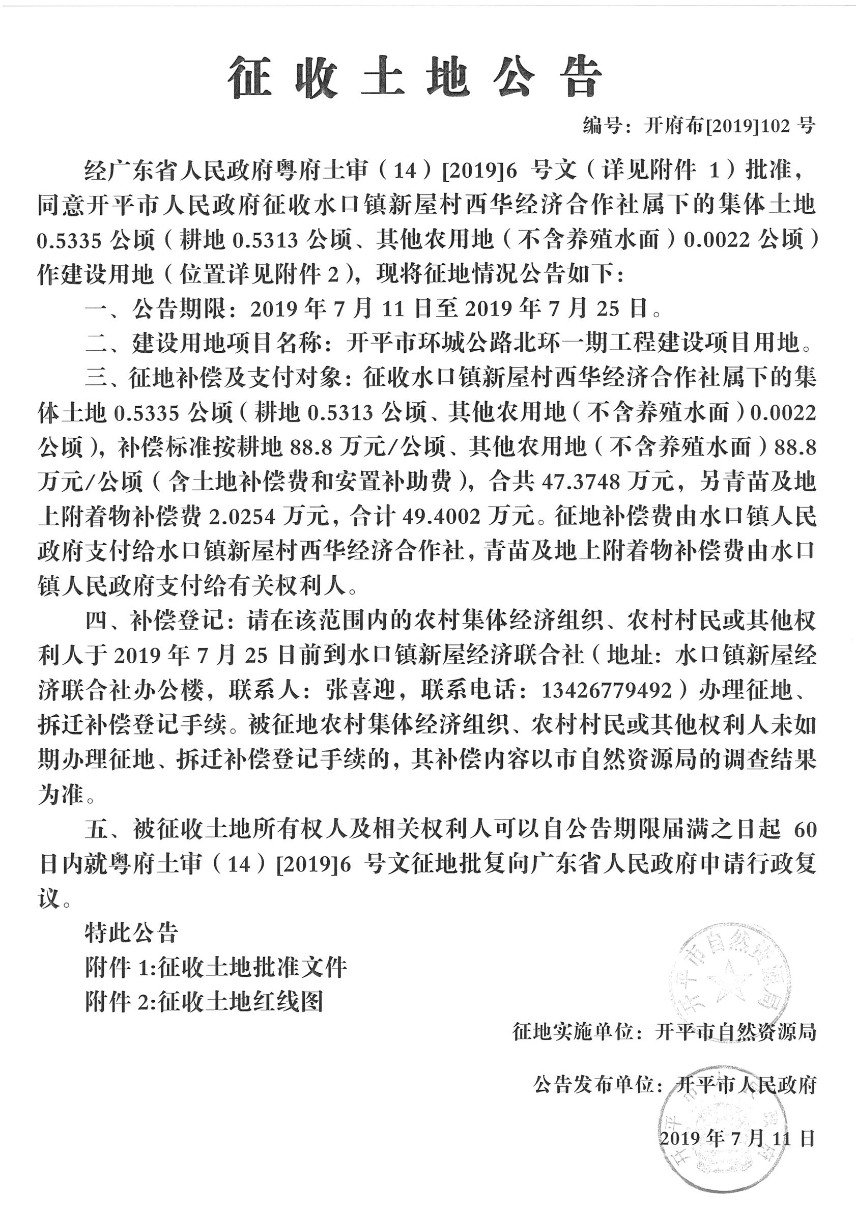 征收土地公告(开平市环城公路北环一期工程建设项目用地)