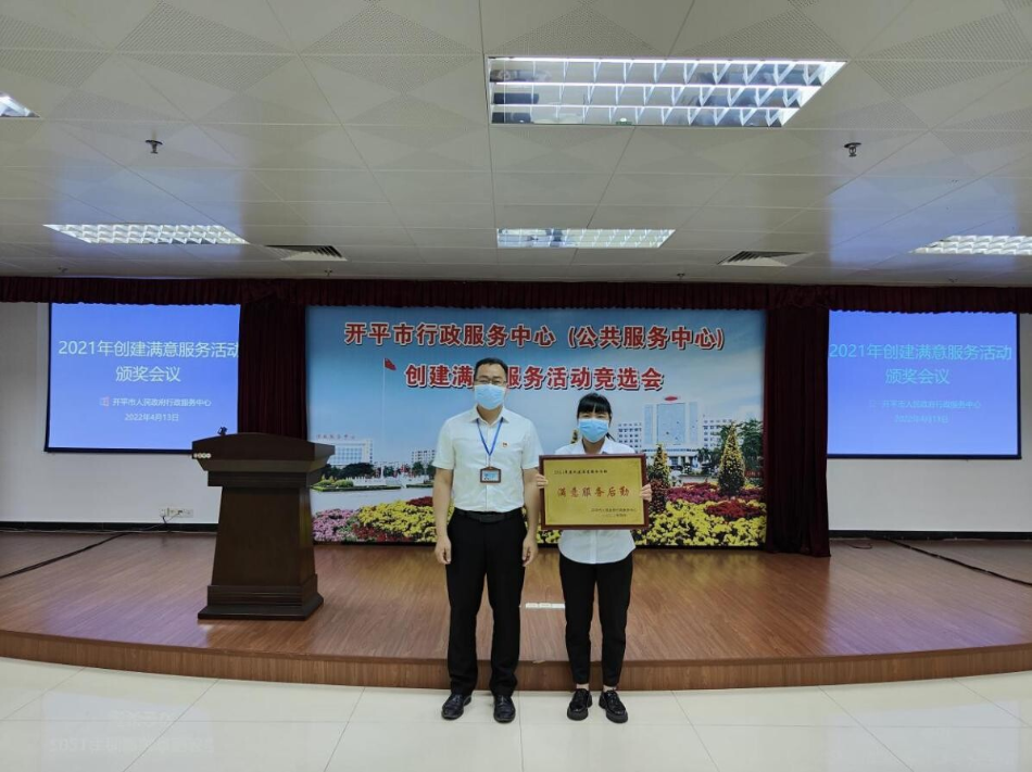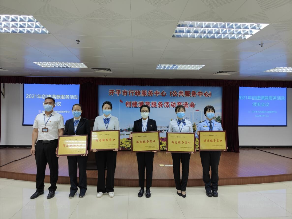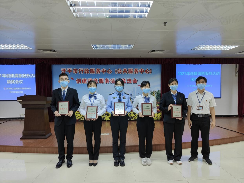 2022年4月12日上午,开平市人民政府行政服务中心召开2021年度创建满意服务活动表彰大会,市政务服务数据管理局主要领导,行政服务中心全体职工以及中心服务窗口,审办后台,服务之星代表参加了此次大会。 为加强服务窗口、审办后台、服务后勤管理,促进机关作风建设,创建优质为民服务队伍,提升职工的政治素质和业务能力,充分激发责任意识、服务意识、效率意识和创先争优意识,全力打造服务为民、作风优良的政务服务队伍,推动政务工作再上新台阶,市行政服务中心深入开展创建满意服务活动。经过综合考评并组织公开票选后,分别选出了5个“满意服务窗口”,4个“满意审办后台”、1个“满意服务后勤”和10名“服务之星”。市政数局党组书记、局长龚伟强同志以及市政数局党组成员、行政服务中心主任颜剑超同志分别为获奖代表颁发了奖牌奖状。 行政服务中心始终围绕江门市委“1+6+3”工作安排,紧扣开平市委“六大行动”,以抓好“改文风、转作风、树新风”工作为切入口,不断推动我市政务服务工作再上新台阶,贡献行政服务中心的力量。通过此次评选活动,全体职工将以典型树榜样,大力强化尽职尽责、主动服务的意识,提高服务质量和服务技能,激发服务热情和积极进取精神,提升政务服务水平,推动政务服务工作高质量发展。