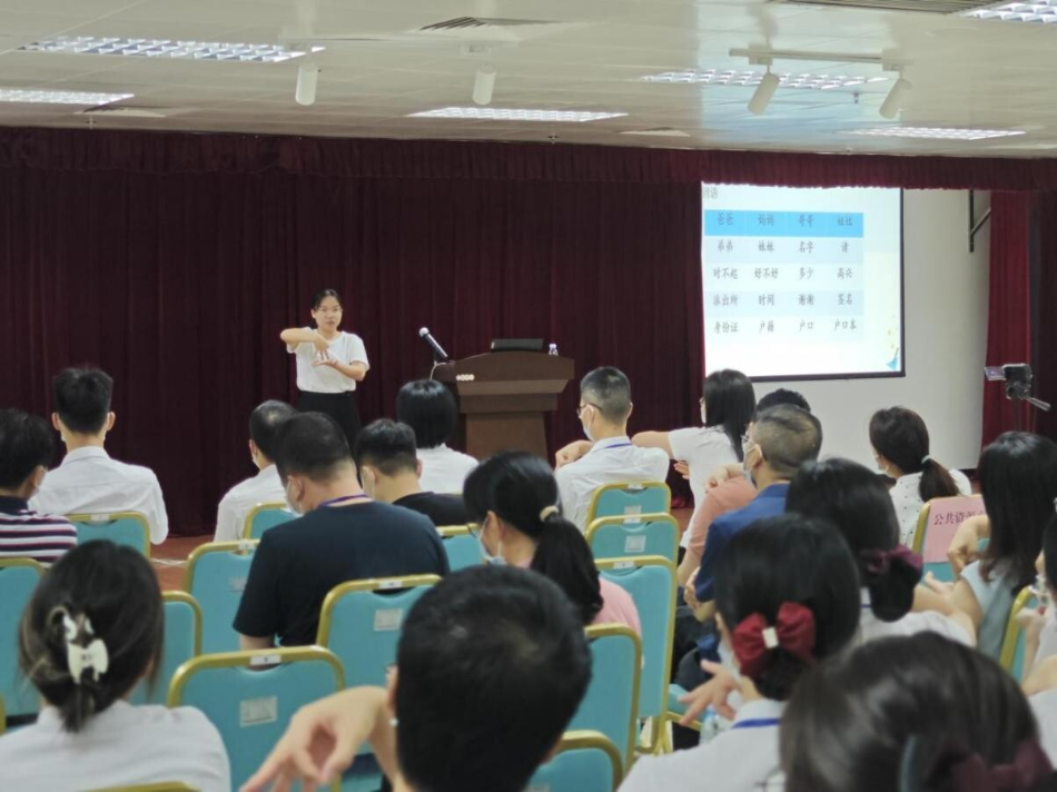 防范始于行”为主题的急救知识培训。课上进行了止血、包扎、溺水、家庭急救等理论知识讲解以及进行了现场实操演示。 随后,开平市特殊教育学校余扬君老师通过现场教学、实操练习、现场抽查等方式,重点围绕政务服务类等方面用语开展手语教学,由浅入深,帮助学员掌握日常政务服务手语交流技巧。 通过此次培训,学员不仅提升了应对突发意外伤害的紧急救援能力,更掌握了与听障人士交流的基本手语,提升自身手语沟通能力。接下来,市行政服务中心将以创建“广东省政务服务标杆大厅”为目标,打造适老化、适残化便民服务大厅,全力配合我市文明城市创建工作,让政务服务更有温度和深度。