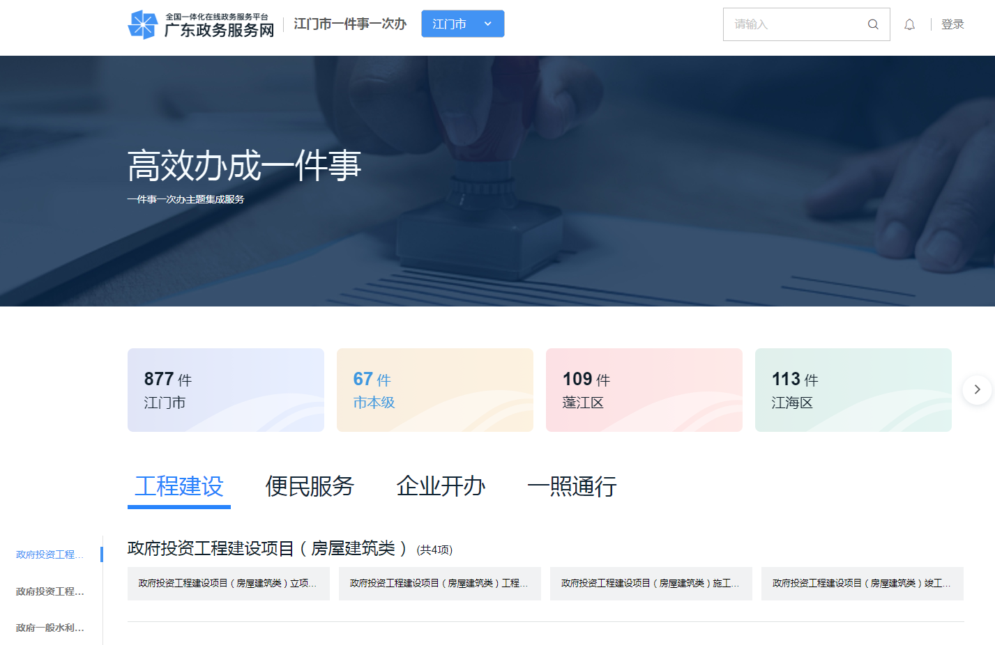 登录广东政务服务网,切换到江门市(https://www.gdzwfw.gov.cn/?region=440700),输入一件事主题名称,点击搜索,或在特色创新模块点击【高效办成一件事】,选择“开平市”对应需要办理的一件事服务,按流程在线操作即可完成办理。