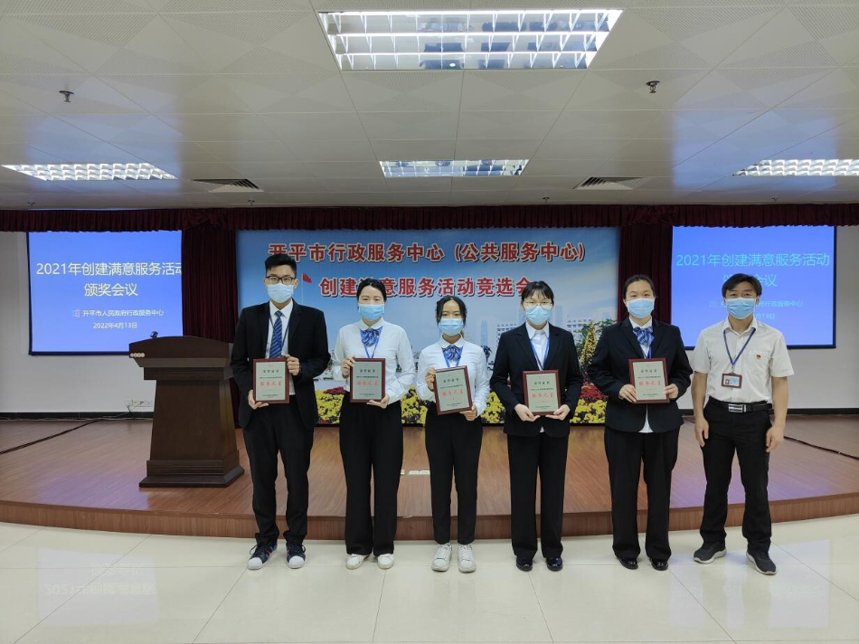 2022年4月12日上午,开平市人民政府行政服务中心召开2021年度创建满意服务活动表彰大会,市政务服务数据管理局主要领导,行政服务中心全体职工以及中心服务窗口,审办后台,服务之星代表参加了此次大会。 为加强服务窗口、审办后台、服务后勤管理,促进机关作风建设,创建优质为民服务队伍,提升职工的政治素质和业务能力,充分激发责任意识、服务意识、效率意识和创先争优意识,全力打造服务为民、作风优良的政务服务队伍,推动政务工作再上新台阶,市行政服务中心深入开展创建满意服务活动。经过综合考评并组织公开票选后,分别选出了5个“满意服务窗口”,4个“满意审办后台”、1个“满意服务后勤”和10名“服务之星”。市政数局党组书记、局长龚伟强同志以及市政数局党组成员、行政服务中心主任颜剑超同志分别为获奖代表颁发了奖牌奖状。 行政服务中心始终围绕江门市委“1+6+3”工作安排,紧扣开平市委“六大行动”,以抓好“改文风、转作风、树新风”工作为切入口,不断推动我市政务服务工作再上新台阶,贡献行政服务中心的力量。通过此次评选活动,全体职工将以典型树榜样,大力强化尽职尽责、主动服务的意识,提高服务质量和服务技能,激发服务热情和积极进取精神,提升政务服务水平,推动政务服务工作高质量发展。