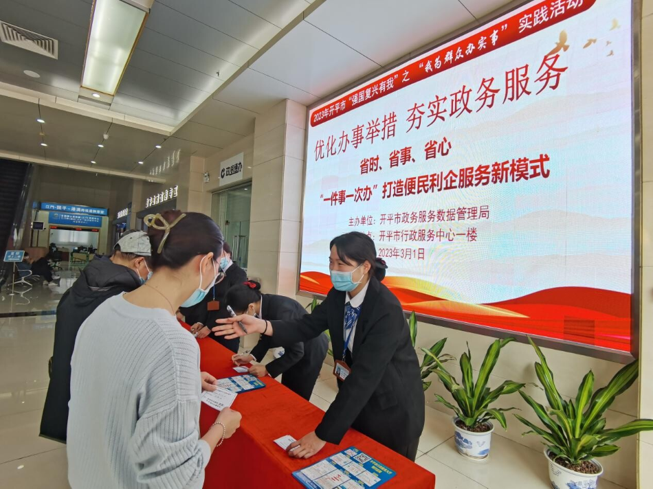 为进一步提升政务服务效能,实现“一件事一次办”成,3月1日上午,开平市政数局在开平市行政服务大厅一楼开展以“一件事一次办”便民利企服务新模式为主题的“强国复兴有我”之“我为群众办实事”实践活动。活动现场,工作人员向办事群众着重讲解“一件事一次办”服务新模式可办理事项清单和办理流程。