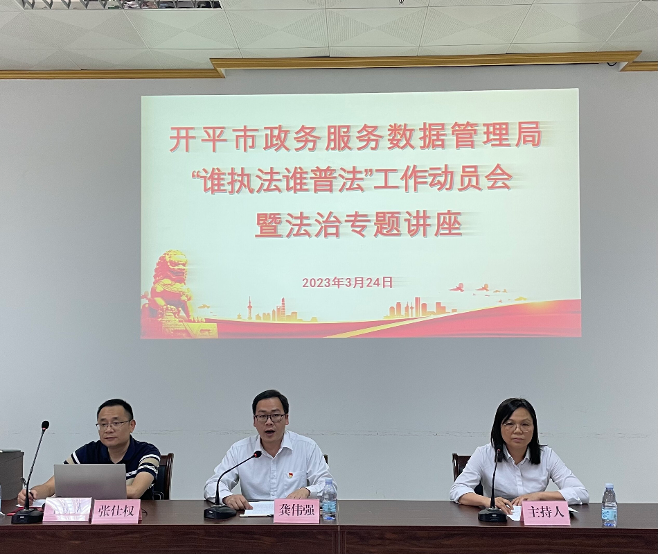 深入学习宣传习近平法治思想,进一步落实“谁执法谁普法”“谁服务谁普法”责任扎实推进法治建设,提高广大干部职工尊法学法守法用法的意识和能力,324日下午,市政数局召开普法工作动员会暨法治专题讲座。局机关及下属单位机关全体人员、行政服务中心服务窗口和审办后台负责人参会。