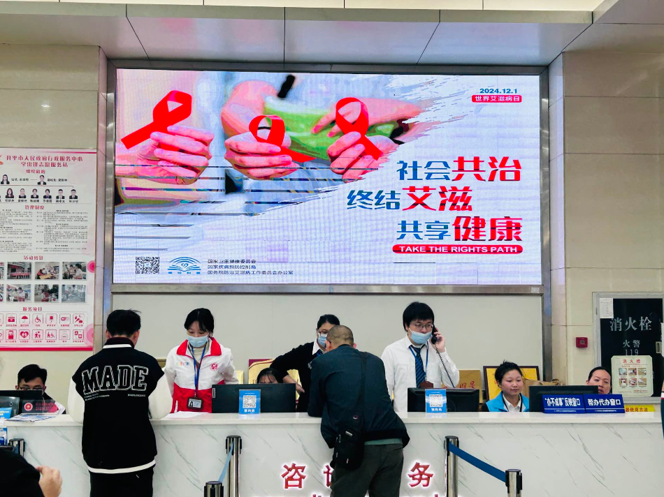 为进一步推动艾滋病防治工作,营造全社会参与艾滋病防治工作的良好氛围,近日,开平市政数局开展艾滋病防治宣传。在行政服务中心一楼大堂LED屏幕上循环播放世界艾滋病日公益海报,并在大堂无障碍低位服务台、“政务服务”24小时自助服务区咨询区、二楼自助取号机旁、三楼公共资源交易中心窗口和青年学习园地等地方放置《艾滋病咨询检测十八问》《男性保健手册》《女性防病须知》手册,志愿者也积极向群众宣传艾滋病防治知识。