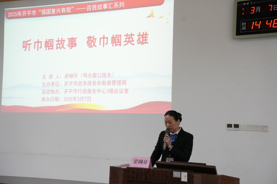 为进一步深化中国特色社会主义和中国梦学习宣传教育,大力弘扬以爱国主义为核心的民族精神和以改革创新为核心的时代精神,引导职工干部牢固树立共产主义远大理想和中国特色社会主义共同理想,3月7日,市政务服务和数据管理局、市行政服务中心、公共资源交易中心联合举办“强国复兴有我”百姓故事汇活动。 活动中,政务服务大厅导办咨询窗口组长梁柳开分享省妇联副主席陈晓霞以及自己的政务故事。 多年来,广东省妇联副主席陈晓霞全身心投入妇女儿童权益保护工作,推动众多公益项目落地。这些项目如温暖的阳光,照进无数困境女性的生活,帮她们重获平等机遇与尊严。陈晓霞是妇女权益的坚定守护者,是众多女性心中指引方向的明灯,她用行动证明,女性的力量不仅能改变自身命运,更能推动社会进步。 陈晓霞的事迹激励着全体政务人。梁柳开同志作为政务服务大厅的一员,在导办咨询窗口工作近15年,始终秉承“群众的事就是我的事”的宗旨,坚守初心,将群众需求置于首位。 政务同行,巾帼展英姿,辉映“半边天”。市政务服务和数据管理局将一如既往,不断改革创新、提升服务水平,充分发挥“巾帼文明岗”的引领和示范作用,为助力开平市高质量发展贡献巾帼智慧和力量!