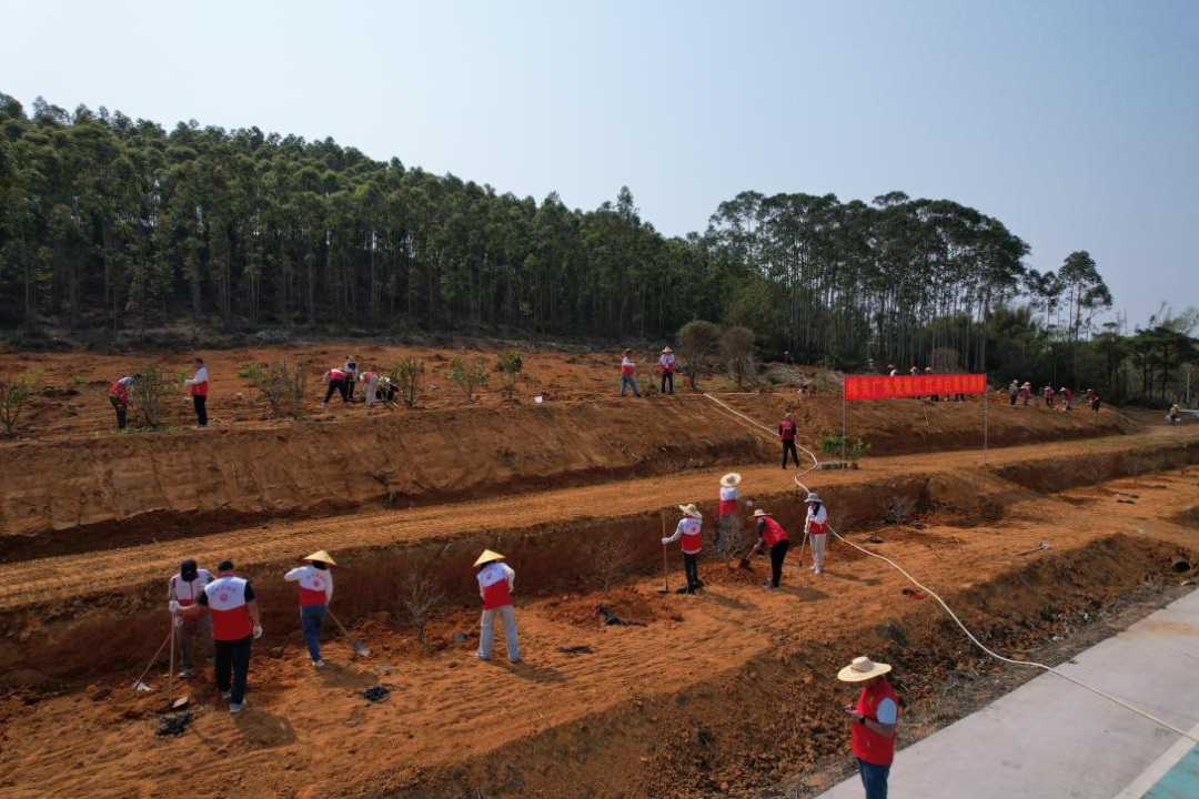 植树活动现场呈现一派热火朝天的景象。30余名市镇两级机关干部与红丰村干部群众齐心协力,在市农业农村局专家指导下规范完成挖穴、扶苗、培土等工序。经过1个多小时奋战,150多棵嘉宝果、黄皮、百香果等果树树苗在红丰马冈鹅养殖基地旁错落挺立,与周边的绿水青山相互映衬。 新栽的果树树苗终将成荫,结出的硕果也将进一步推动乡村产业多元化发展,培育农村产业新业态。接下来,马冈镇将进一步丰富乡村绿化内容,提升乡村绿化质量和效益,努力实现生态美、产业兴、百姓富有机统一,谱写“绿水青山就是金山银山”的崭新篇章。3月24日,市农业农村局党组成员、市委农村工作办公室常务副主任、市乡村振兴局常务副局长司徒重诗率领市农业农村局党员干部到马冈镇红丰村开展义务植树活动,以“党建红”引领“生态绿”,为建设“绿美马冈”再添新动能。马冈镇党委书记郁长青,镇人大主席陈振坤以及有关分管领导参加活动。