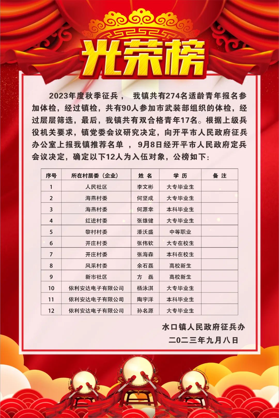 水口镇人民政府2023年秋季征兵入伍光荣榜