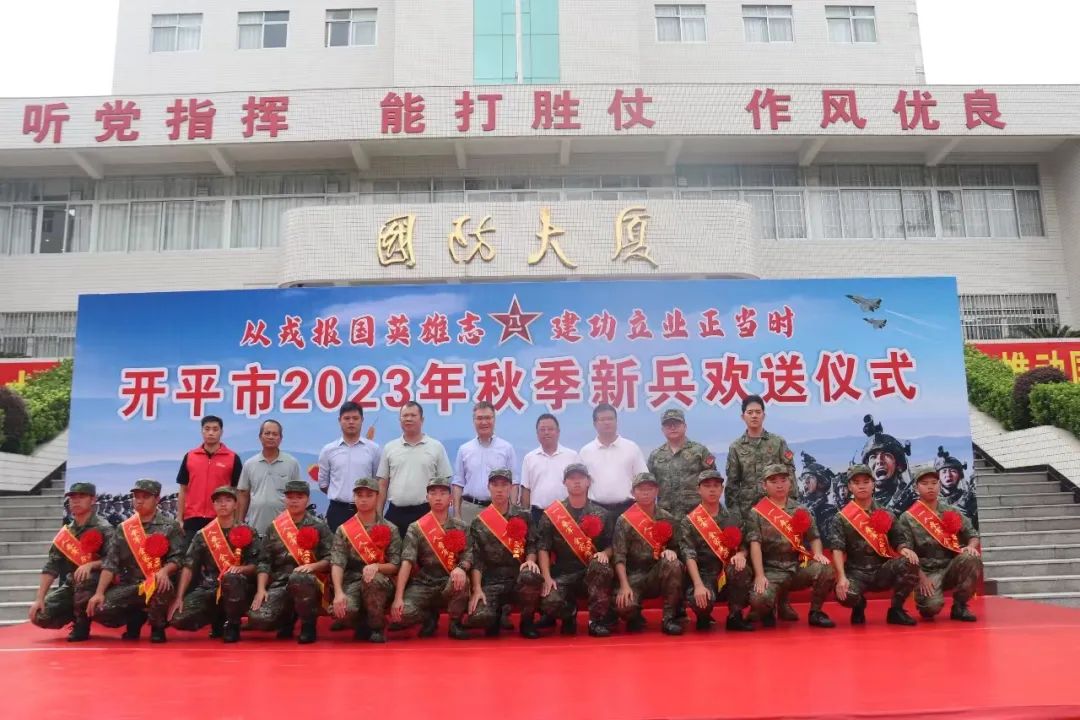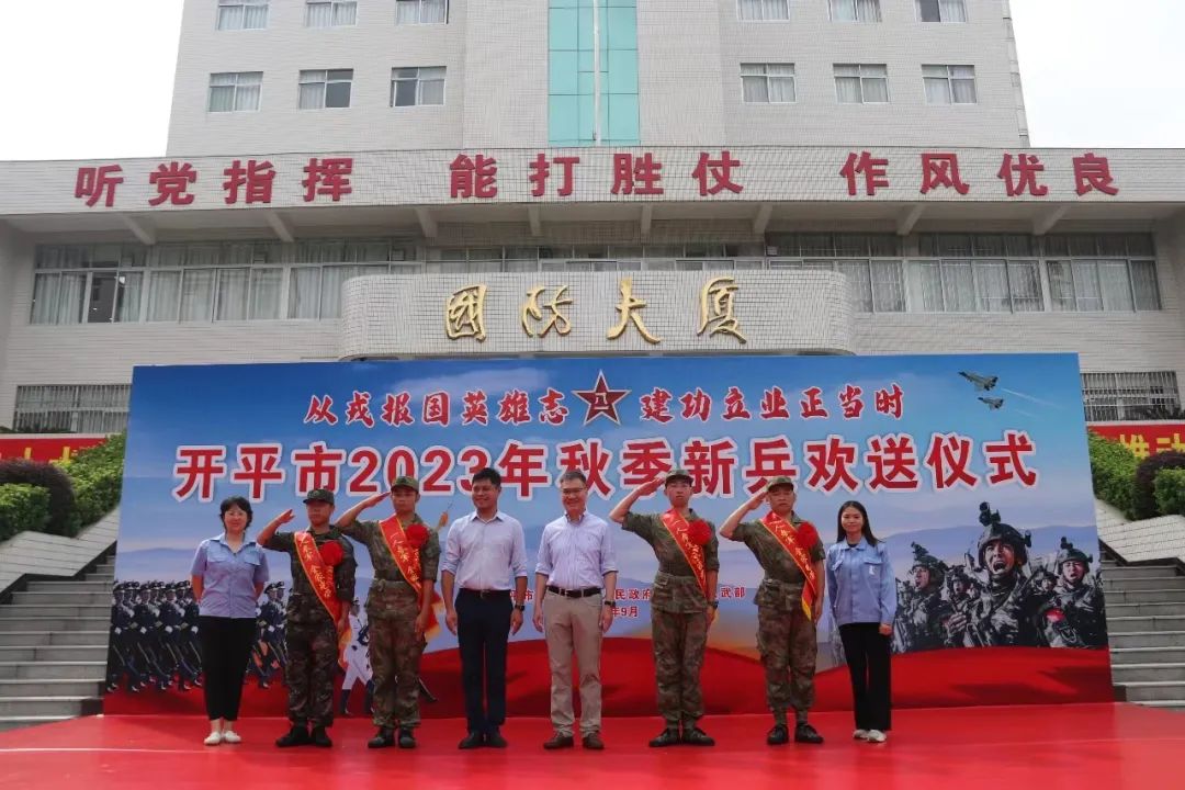 开平市政协副主席、水口镇党委书记刘剑锋,镇党委副书记、镇长胡万程,镇人大主席张金海,镇党委委员、武装部长马文斌,开平依利安达电子有限公司代表到市国防大厦欢送2023年秋季新兵入伍。