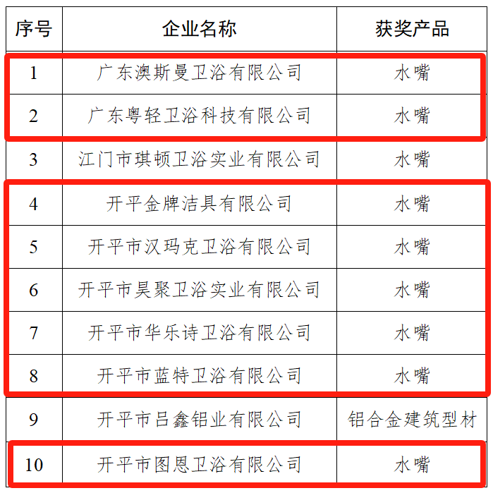 近日,经开平市人民政府审批同意,确定广东澳斯曼卫浴有限公司等10家企业为2023年开平市工业产品质量优秀奖获奖企业,其中,水口镇8家优秀企业入围,具体获奖名单如下: