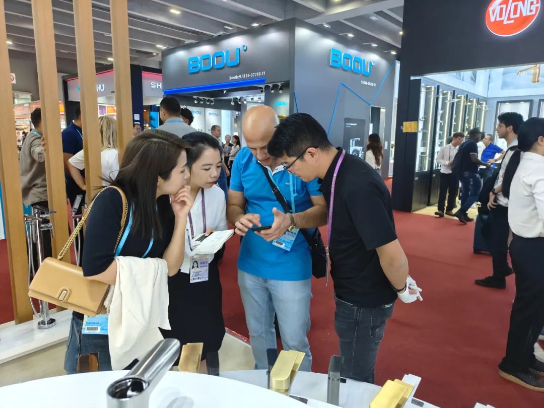 卫浴展区前客商云集,人气火爆。造型精美、质量过硬的产品吸引了来自全球各地的采购商、经销商走进水口镇水口卫浴企业展位,了解产品性能,对接订单业务,现场的洽谈区围坐得满满当当。