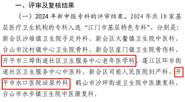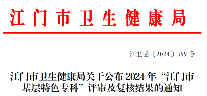 近日,根据《江门市卫生健康局关于印发〈江门市基层特色专科建设与评审工作方案〉的通知》(江卫函〔2024〕212 号)精神,我市基层医疗卫生机构的学科体系建设取得了重要成果。一是在2024年度江门市基层特色专科评审中,我市开平市水口医院泌尿外科和开平市三埠街道社区卫生服务中心老年医学科脱颖而出,成功入选“江门市基层特色专科”。二是2020年已获评专科的复核结果继续保留开平市苍城镇中心卫生院颈肩腰腿痛专科 “江门市基层特色专科”称号。这就标志着我市基层医疗卫生服务能力和学科发展水平逐年提升。