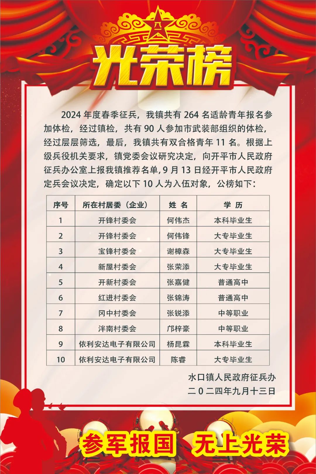 2024年春季征兵,水口镇共有146名适龄青年报名应征青年积极响应国家号召,参加征兵体检,接受严格挑选。经过体检、政考、定兵等环节,水口镇共有16名优秀青年光荣入伍。