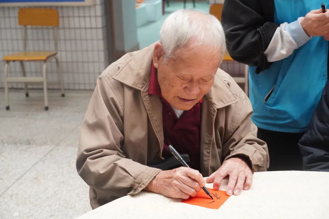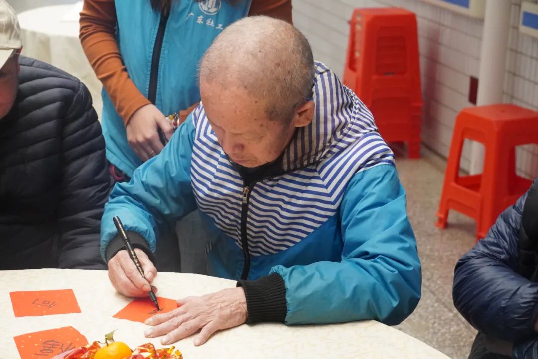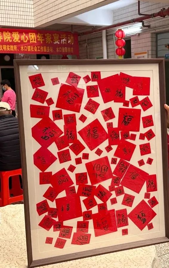 随后开展的是“墨香写福,喜纳吉祥”活动,长者们在志愿者们的指导和协助下,将新年的祝福与美好的愿景融福字间。每一笔、每一划,都寄托在老人们对新一年的美好愿望以及志愿者们对老人们的深深祝福。志愿者们把每一位长者书写鲜艳饱满的“福”字都收录保存到相框里,汇聚成“大”福气,祝愿所有长者福寿安康,万事顺遂。