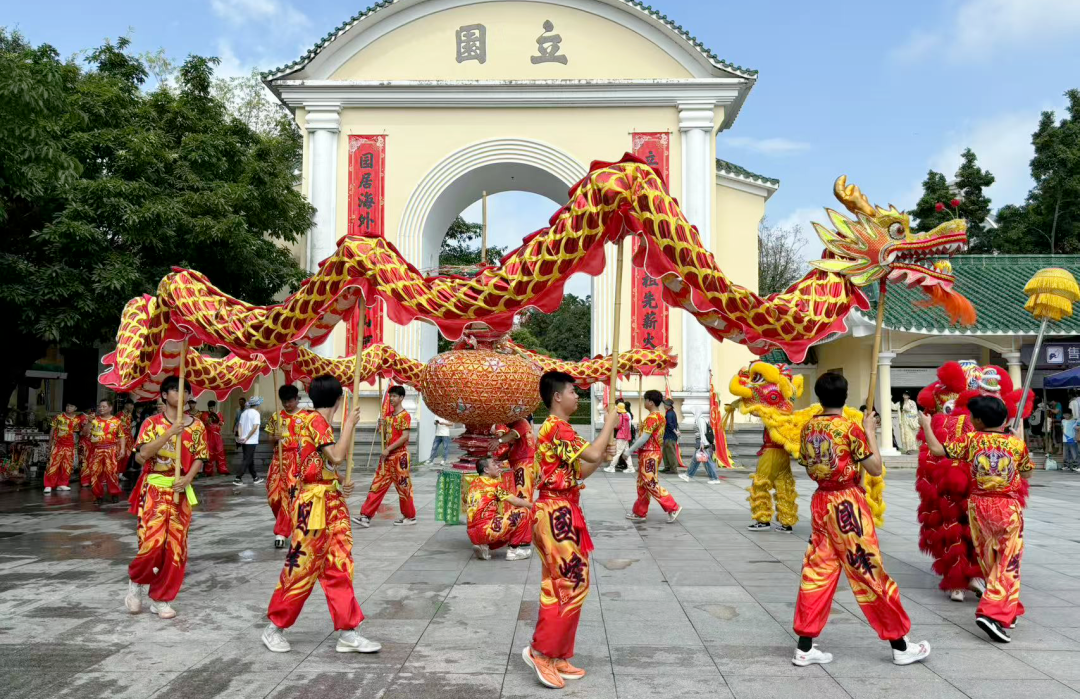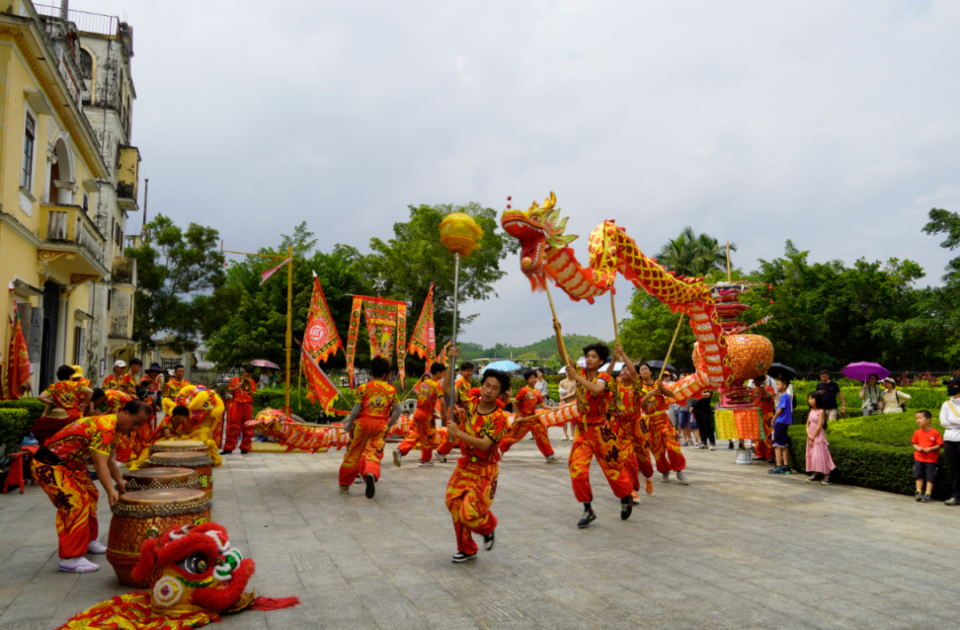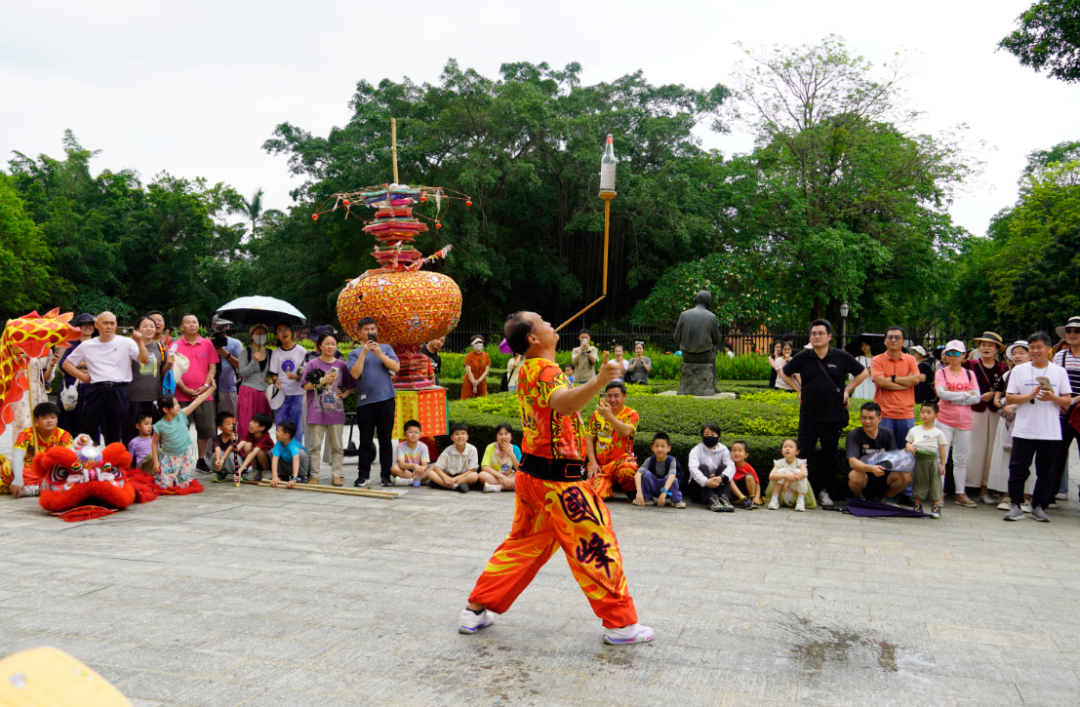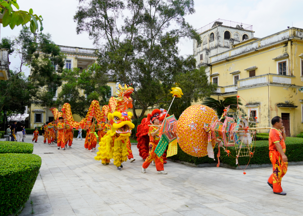 在立园内,每天安排三场演出,泮村花灯展示、泮村灯会巡游展演、开平民间杂技表演等非遗项目轮番登场,非遗展演与侨乡建筑相映成趣,吸引大批游客驻足。