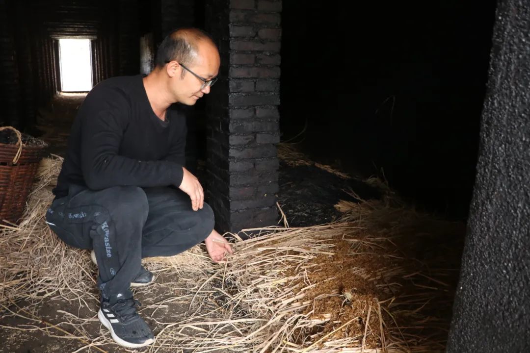 “熏烘火蒜大概需要15天时间。熏房分上下两层,下层用来点燃禾秆草。我们把干的禾秆草铺开之后,会在上方再铺一层湿的谷壳,防止禾秆草燃烧的时候产生明火。燃烧禾秆草的烟熏到二层的蒜,每次大概熏两个小时,一天熏两次,熏15天。”