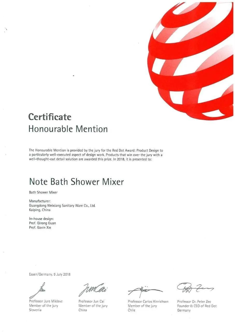 伟祥卫浴致力于打造具有前瞻性、设计感、实用性的卫浴产品,为消费者带来个性与实用相结合的卫浴产品。深耕行业十余载,伟祥卫浴已获得近一百项国家专利认证。伟祥卫浴自主研发的“MUSE”卫浴原创系列产品——“面盆龙头1W100100CP”“淋浴龙头1L137000CP”“浴缸淋浴龙头1L136900CP”分别斩获“德国红点设计奖”及“IF国际设计奖”双料奖项。