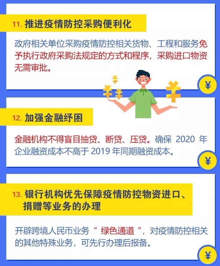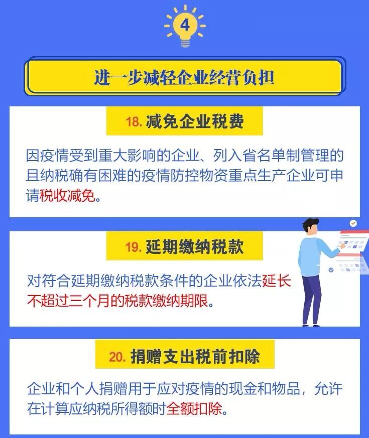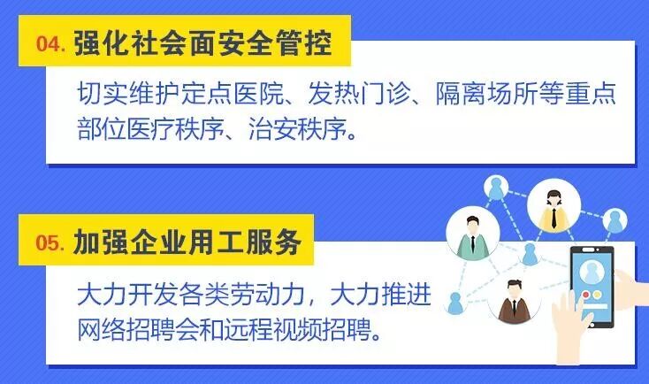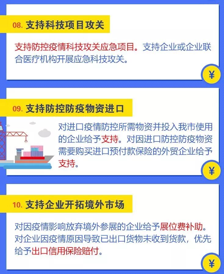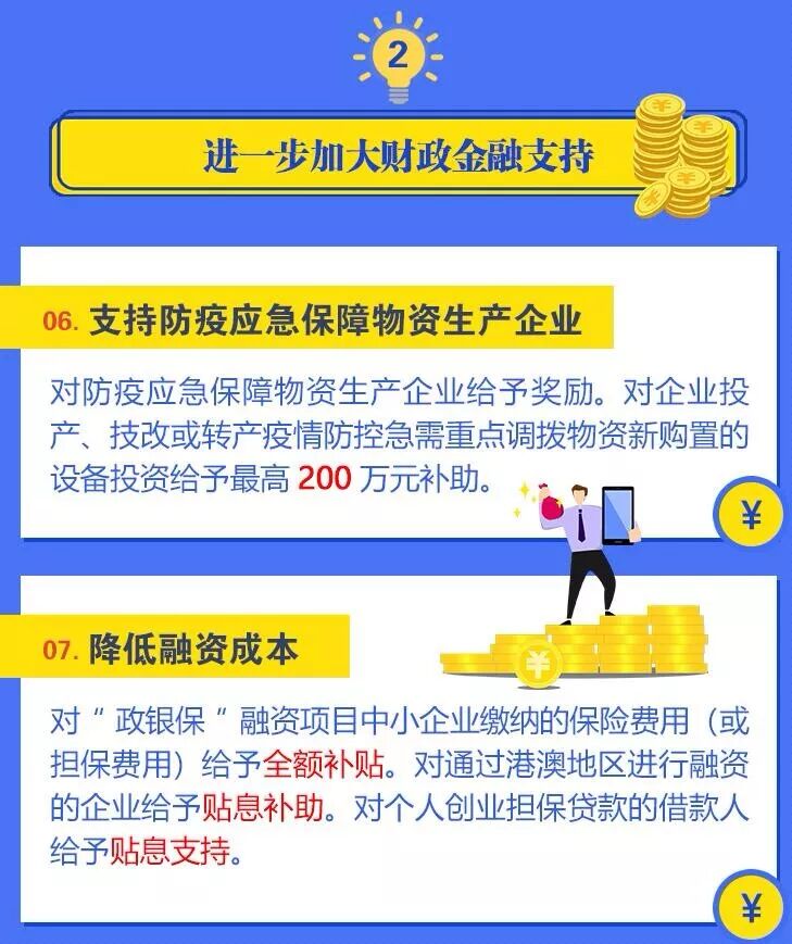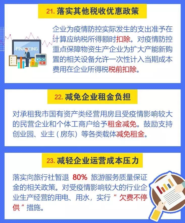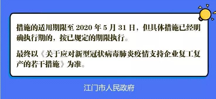 一、加大保障企业复工复产力度 “一企一策”帮助企业协助解决职工返岗以及防控物资购置问题。落实好“四到位”和“八个一”要求,确保企业在疫情防控达标前提下复工复产。保障交通畅通,确保复工复产人员有序返程及防控物资运输保障;加强企业用工服务,大力推进网络招聘会和远程视频招聘,发动职业院校学生、青年志愿者等,重点支援防控物资生产企业短期用工所需。 二、加强财政金融支持 专门明确对提前复工生产以及扩产、转产防疫应急保障物资的企业给予奖励。通过贴息、补助等方式降低企业融资成本,确保重点物资生产企业资金需求。支持防控疫情科技攻关以及防控防疫物资进口。 三、降低企业用工成本 允许受疫情影响的企业缓缴社会保险费。对不裁员、少减员的企业实施失业保险稳岗返还。对企业所支付的未能返岗的湖北籍务工人员工资待遇给予延迟复工补助,对企业新招用首次在我市就业员工的,给予招工补贴。 四、减轻企业经营负担 因疫情受到重大影响的企业以及列入省名单制管理的疫情防控物资重点生产企业可申请税费减免。减免企业租金负担,对承租我市国有资产类经营用房且受疫情影响较大的民营企业和个体工商户给予租金减免。对受疫情影响较大的行业企业生产经营的用电、用水,实行“欠费不停供”。 五、优化政务服务 明确要设立防控物资进口快速通关“绿色通道”。完善审批工作“直通车”制度。强化疫情防控相关项目建设的用地等要素保障。优化企业征信管理,在“信用江门”网站开设信用修复专栏,引导、支持企业申请信用修复。建立领导联系企业制度,快速协助企业解决受疫情影响产生的问题。