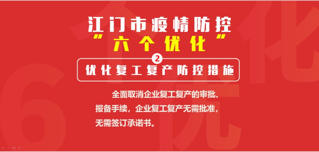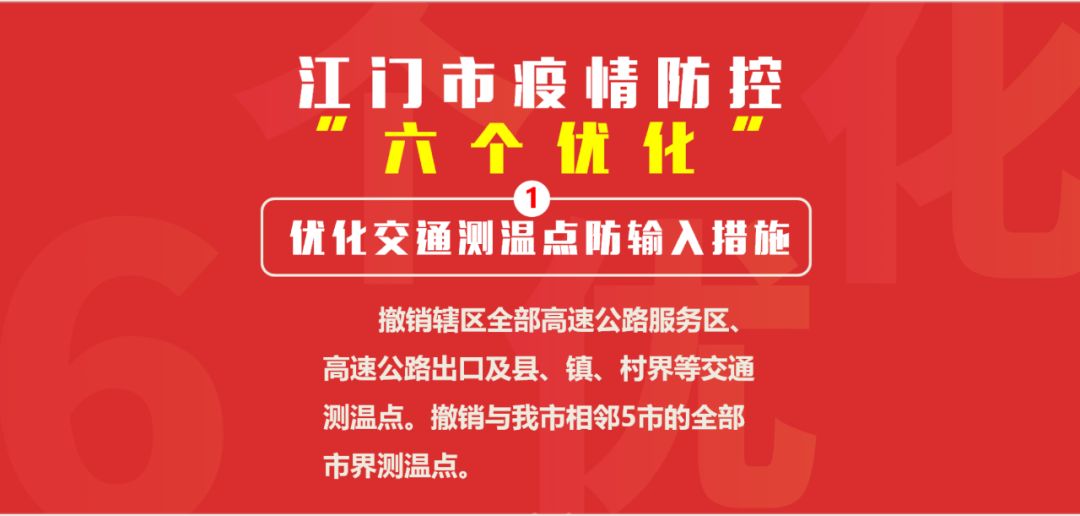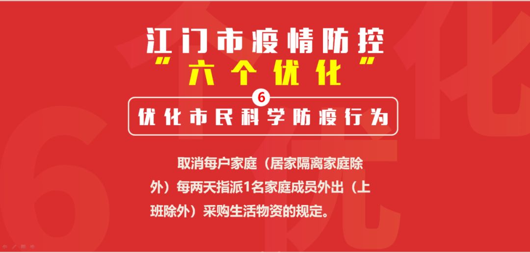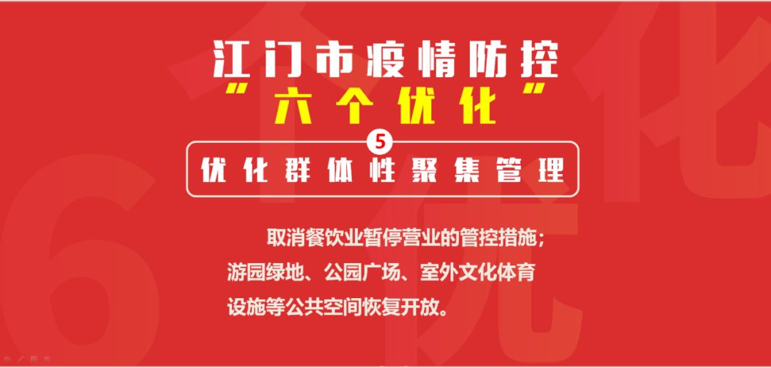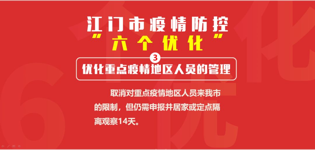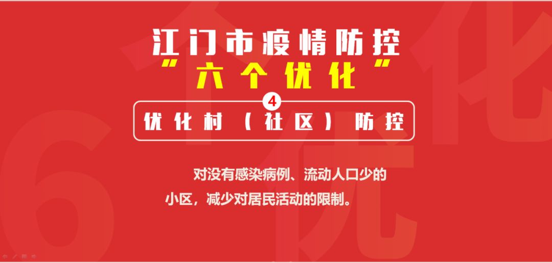 根据国家、省疫情分区分级防控工作指引,结合当前疫情防控形势,近日,江门市对“九个从严”措施作了优化调整,要求执行“六个优化”措施,确保疫情防控和复工复产“两手抓、两不误”。