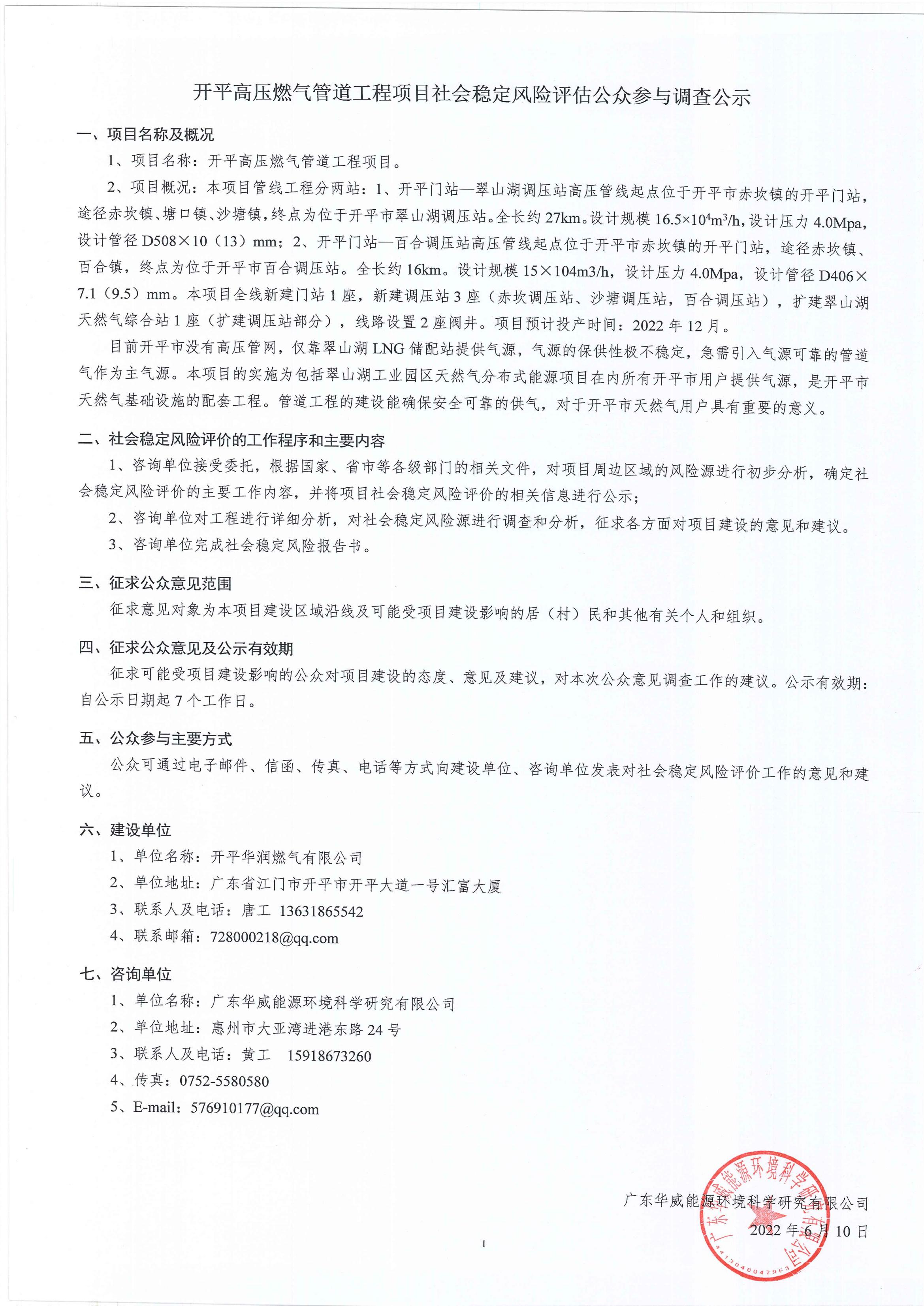 开平高压燃气管道工程项目社会稳定风险评估公众参与调查公示