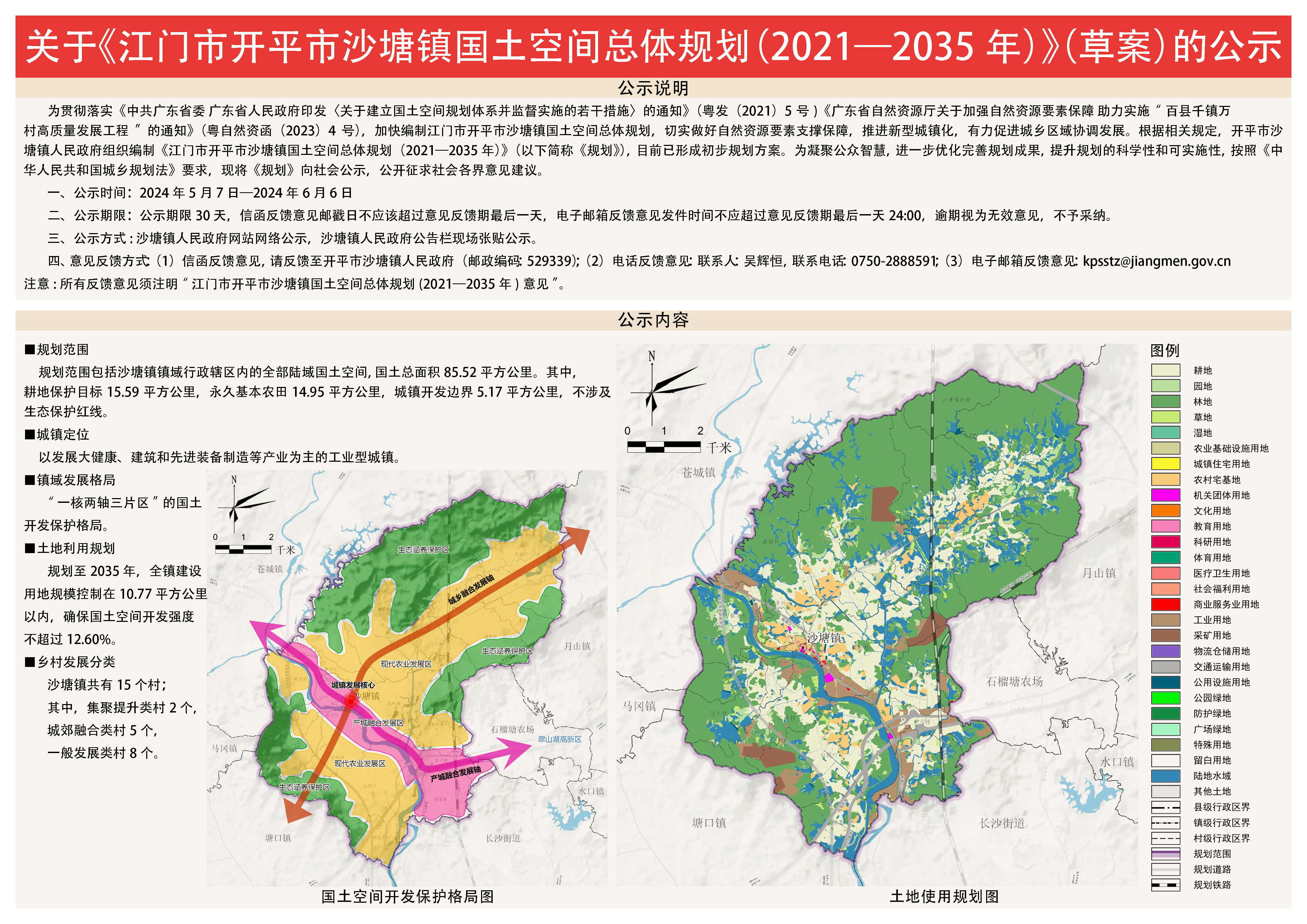 四、意见反馈方式 (1)信函反馈意见,请反馈至开平市沙塘镇人民政府(邮政编码:529339);(2)电话反馈意见联系人 吴辉恒,联系电话:0750-2888591;(3)电子邮箱反馈意见kpsstz@jiangmen.gov.cn注意:所有反馈意见须注明“江门市开平市沙塘镇国土空间总体规划(2021-2035 年)意见”。