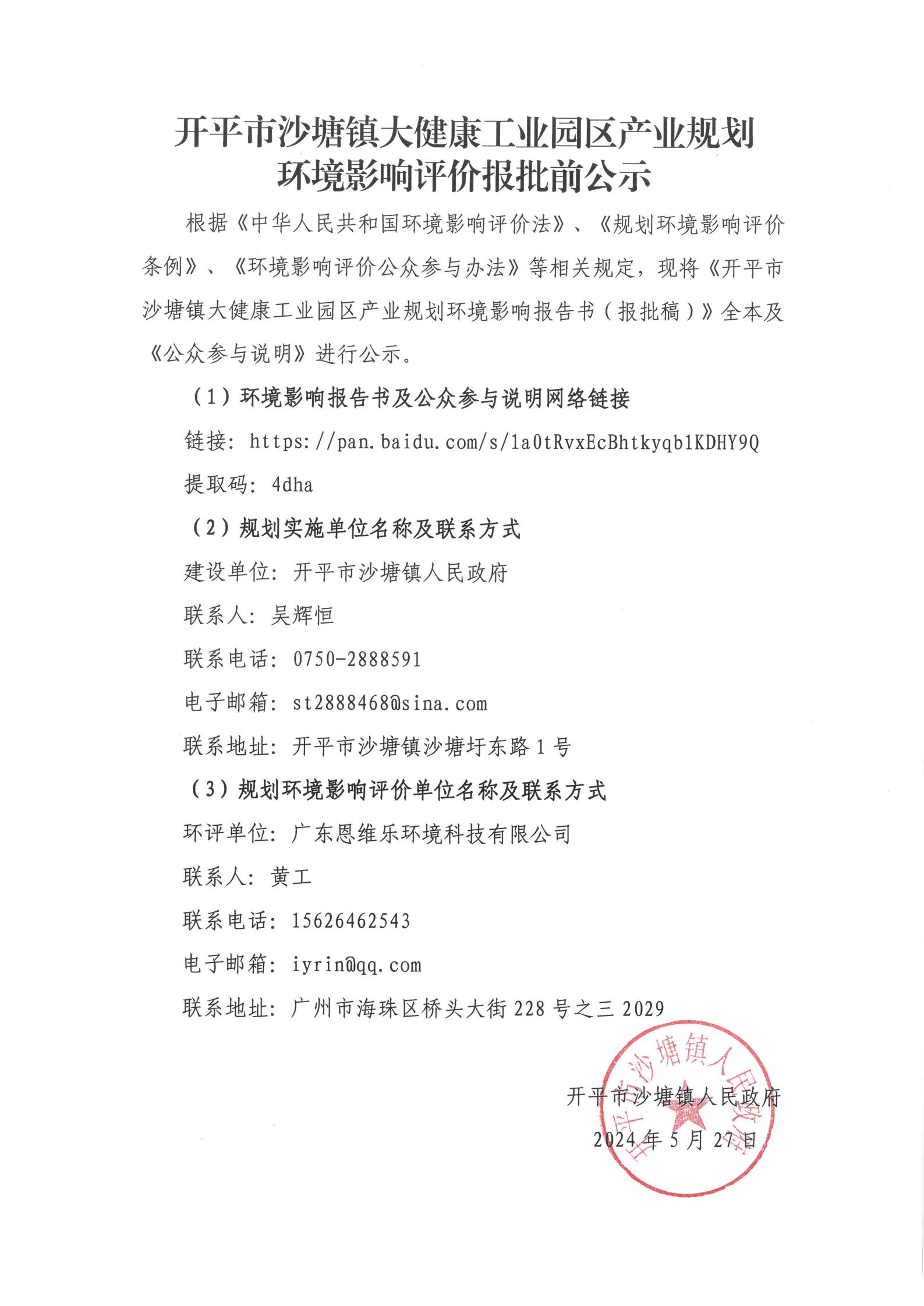 根据《中华人民共和国环境影响评价法》、《规划环境影响评价条例》、《环境影响评价公众参与办法》等相关规定,现将《开平市沙塘镇大健康工业园区产业规划环境影响报告书(报批稿)》全本及《公众参与说明》进行公示。