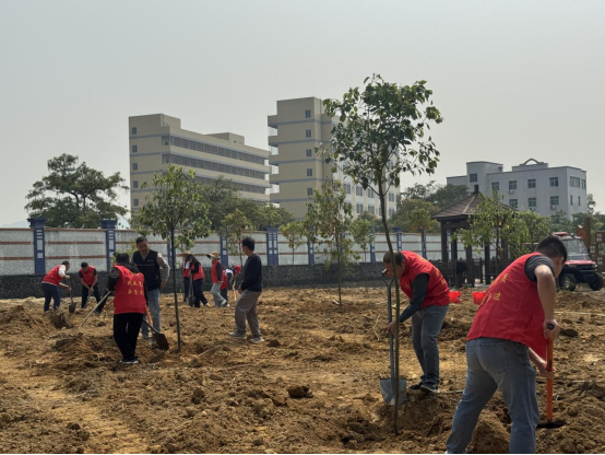 活动现场呈现一派热火朝天的劳动景象,党员干部们干劲十足、热情高涨,有的搬运树苗,有的填土压实,有的修剪枝叶,以实际行动为典型村增添绿植、增加生机、提高绿质、丰富生态底色贡献力量。一株株樟树苗扎根于牛过塘里,与古树公园内的百年老樟树相映成趣,为蚬冈镇的生态文明建设注入了新的活力。